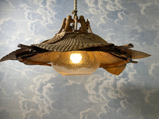 Woven Raffia Fan Pendant Lamp with Glass Shade, Germany, 1950s - possibly Ingo Maurer!