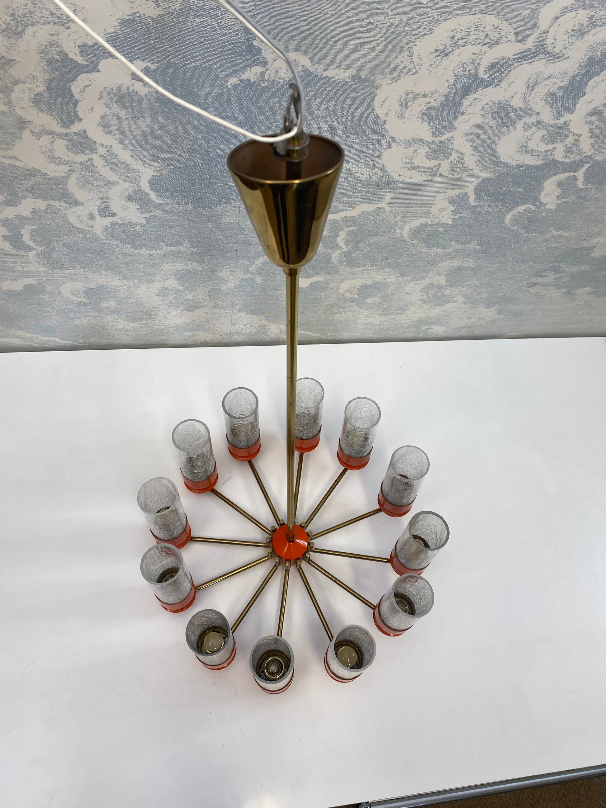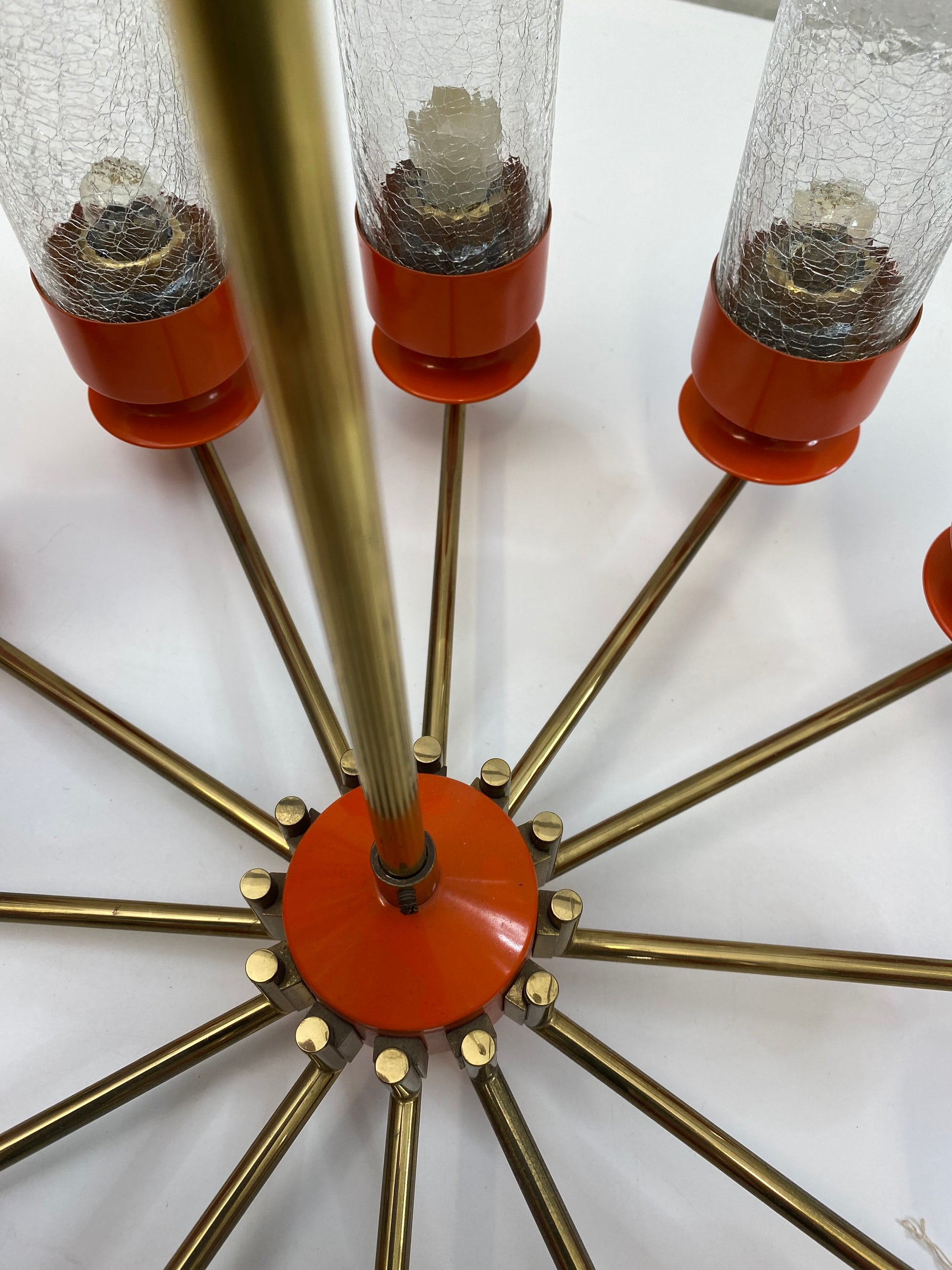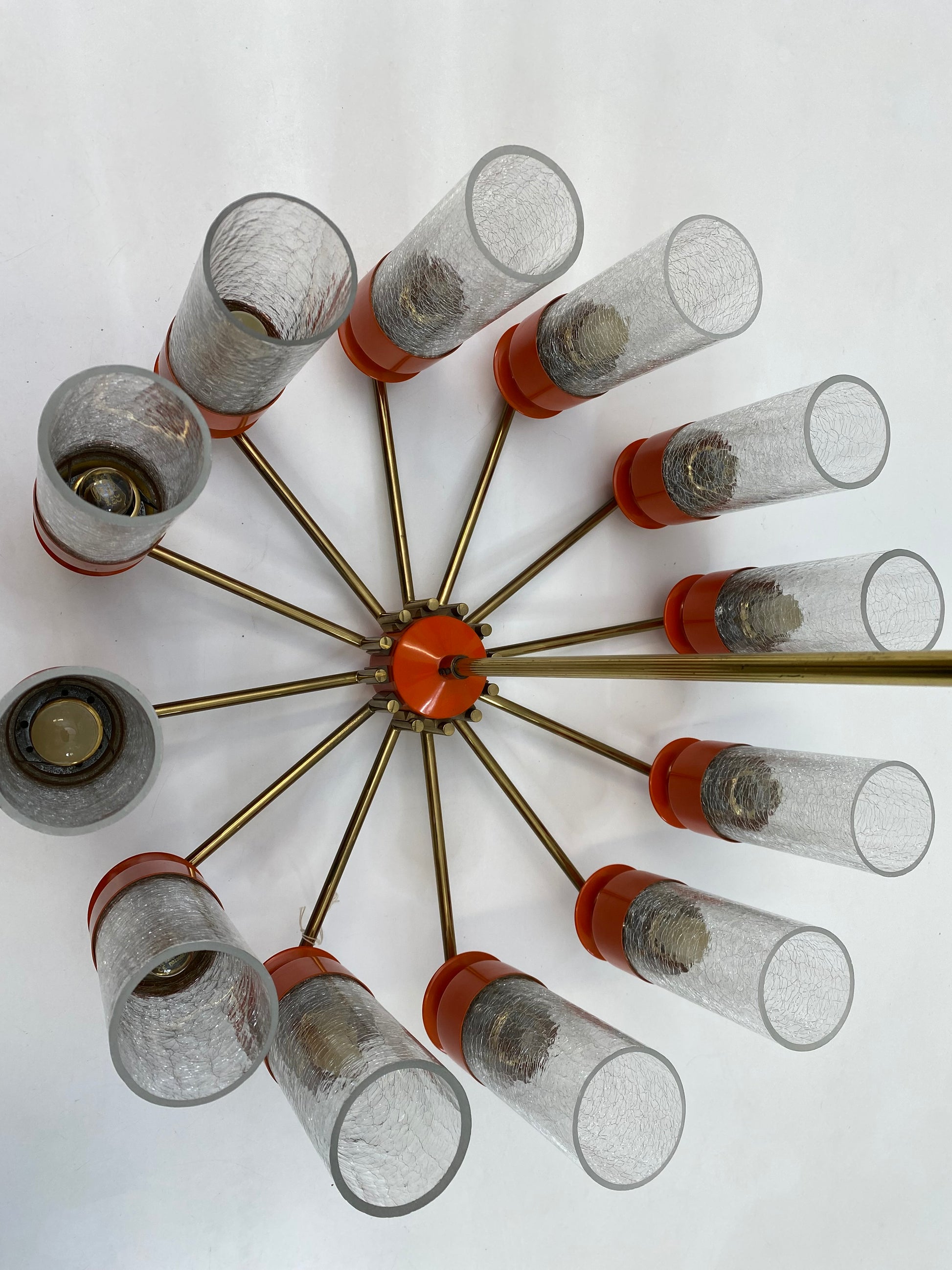 Like spokes on a wheel, 12 brass arms are attached to a metal hub and each arm holds a metal candle-cup supporting an ice-glass insert for the E14 light bulbs.