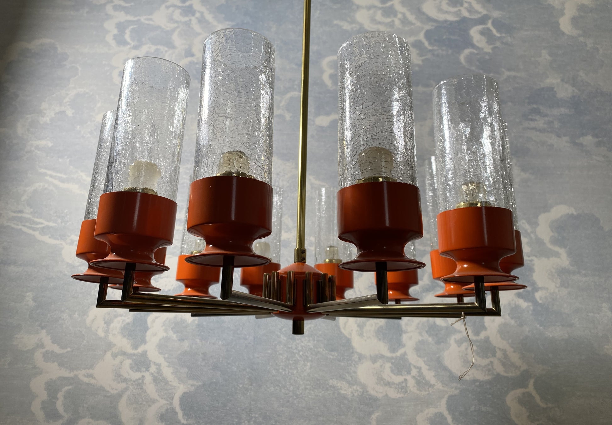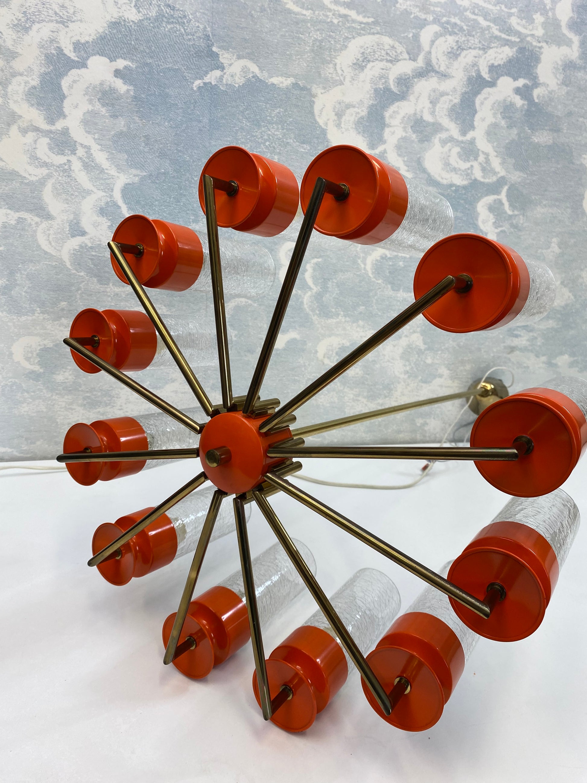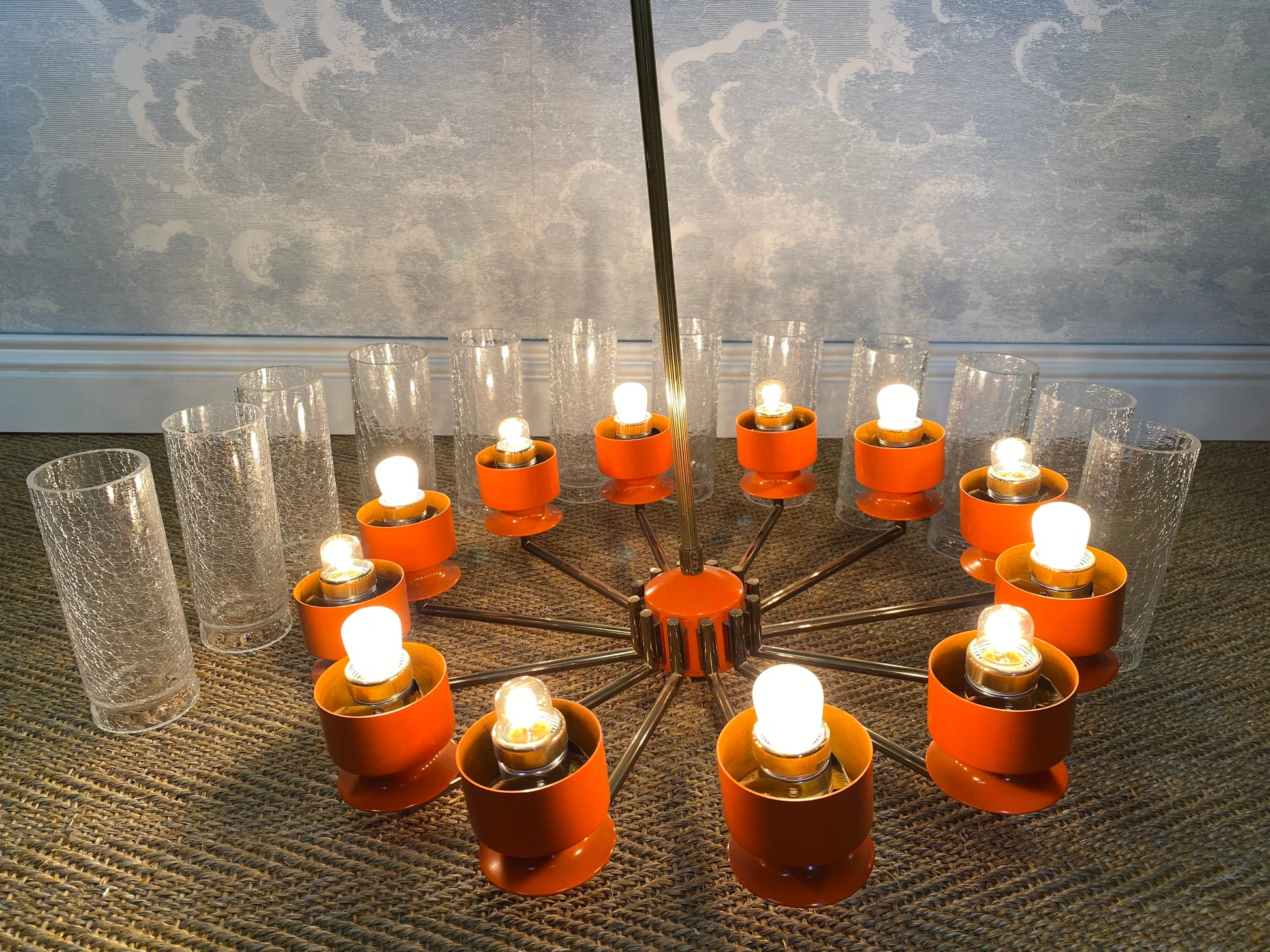 Like spokes on a wheel, 12 brass arms are attached to a metal hub and each arm holds a metal candle-cup supporting an ice-glass insert for the E14 light bulbs.