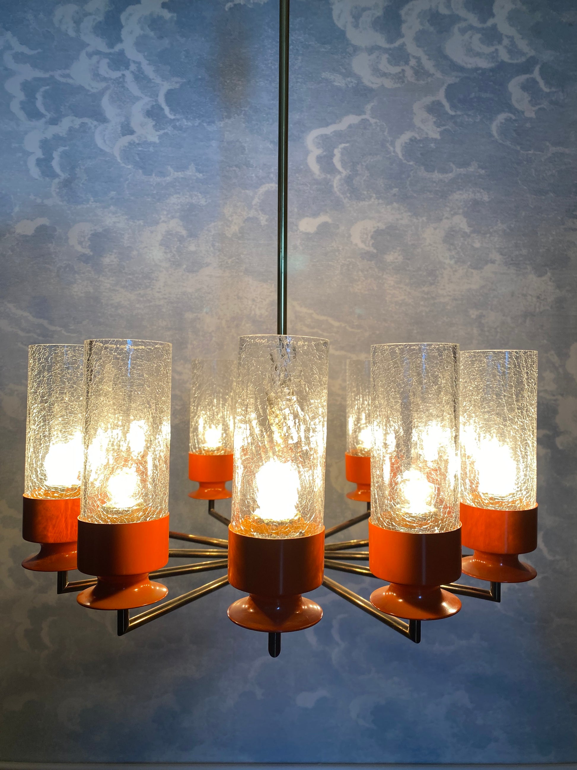 The chandelier is suspended on a brass rod with a brass canopy.