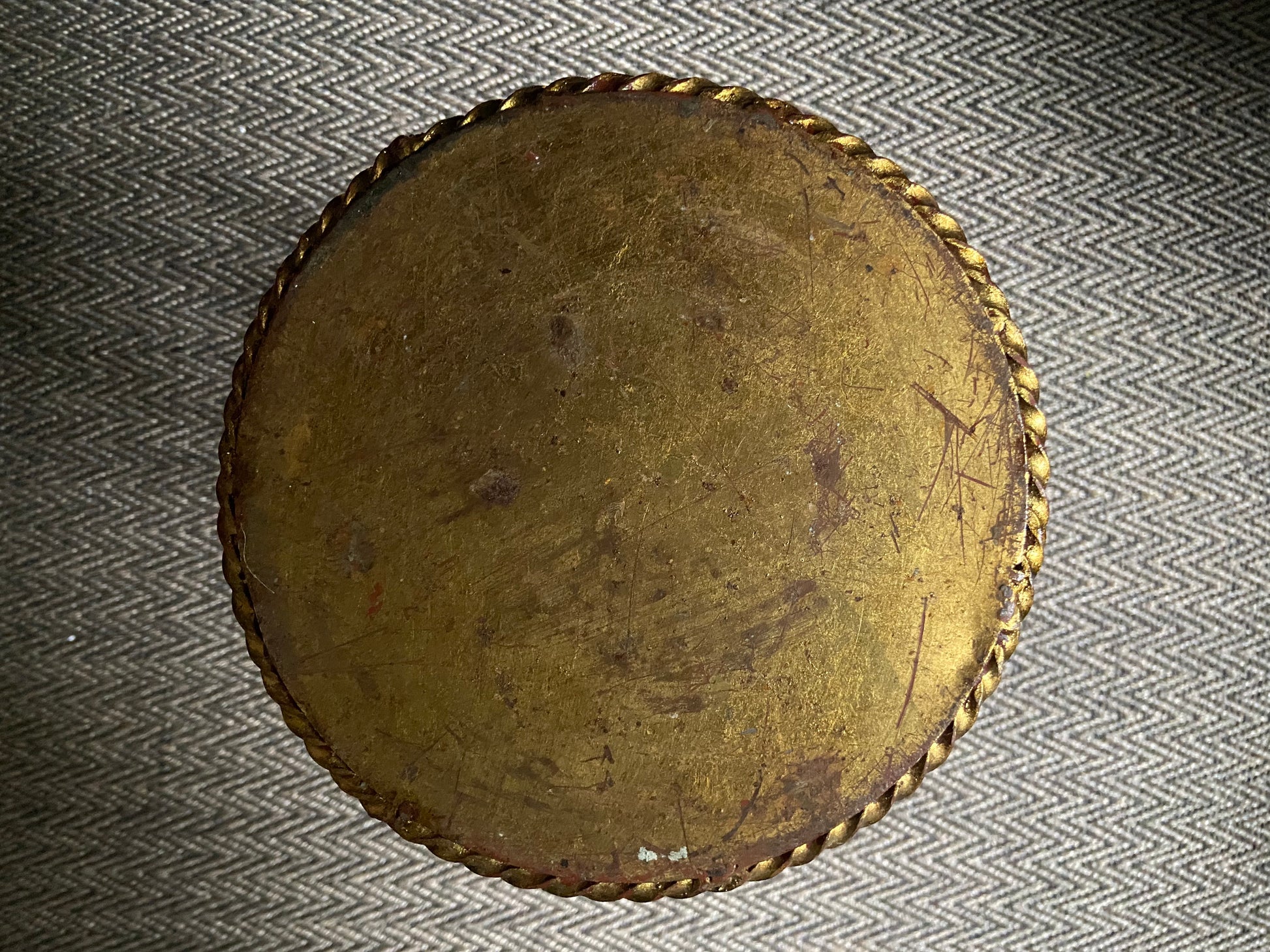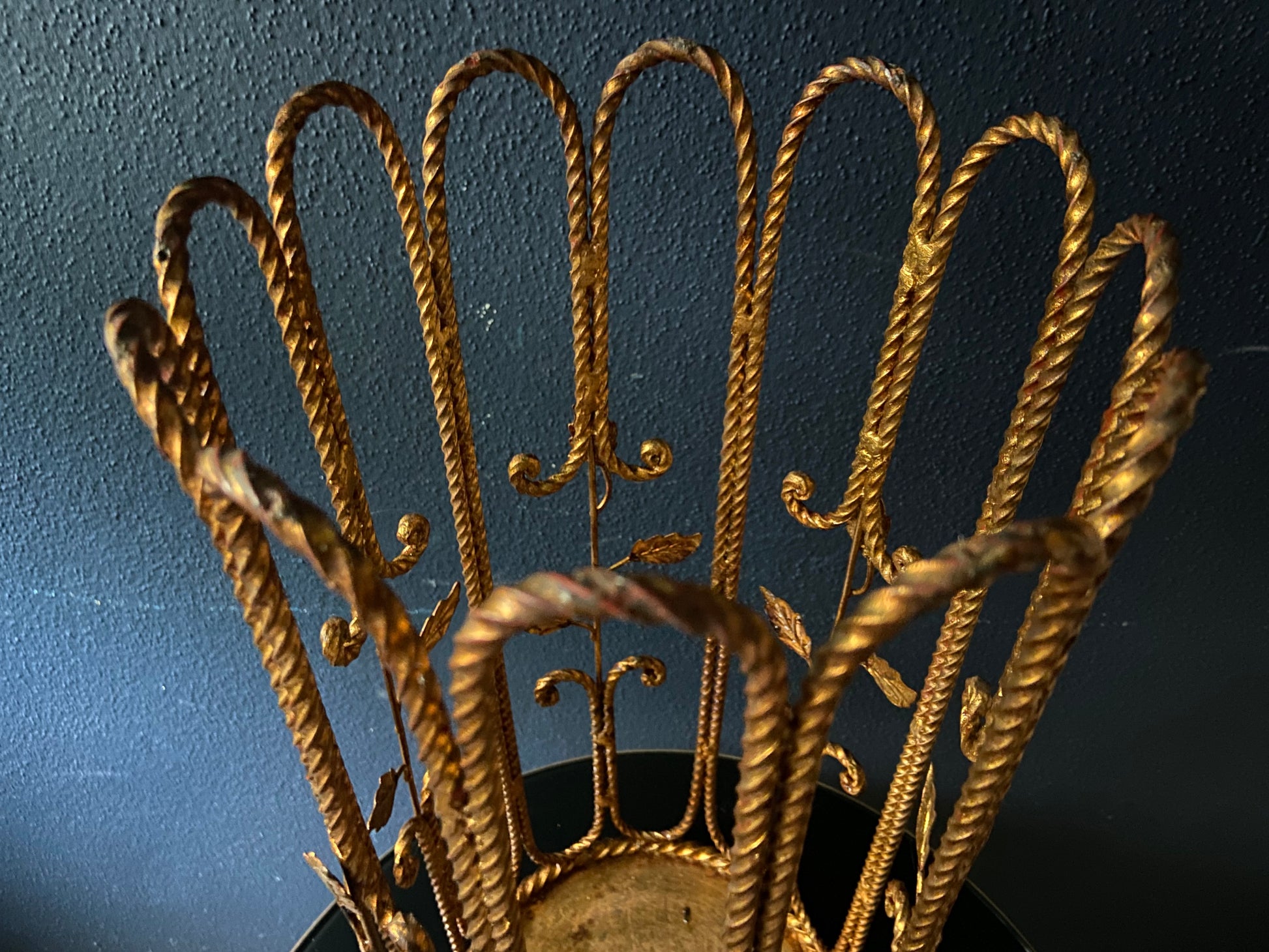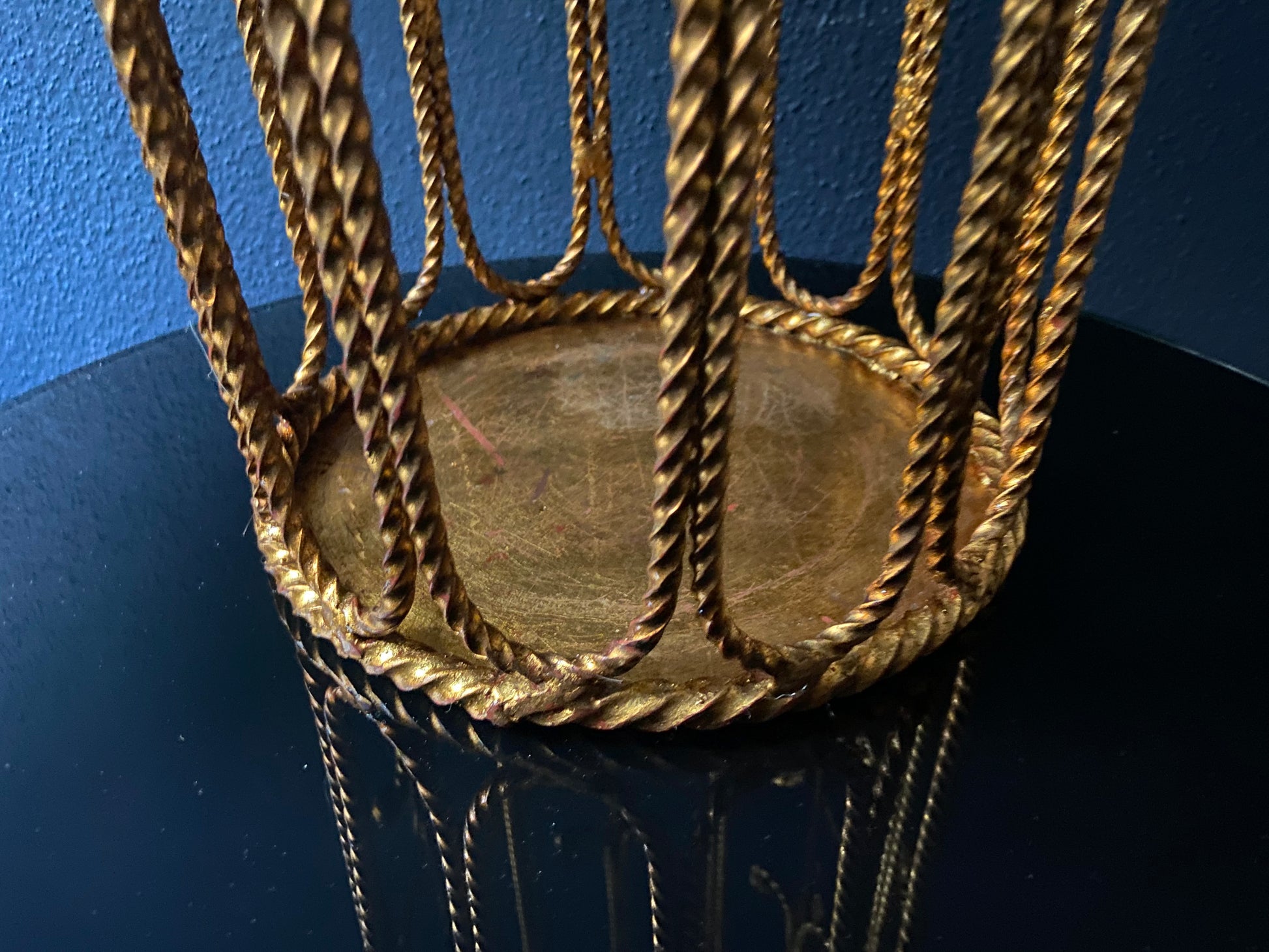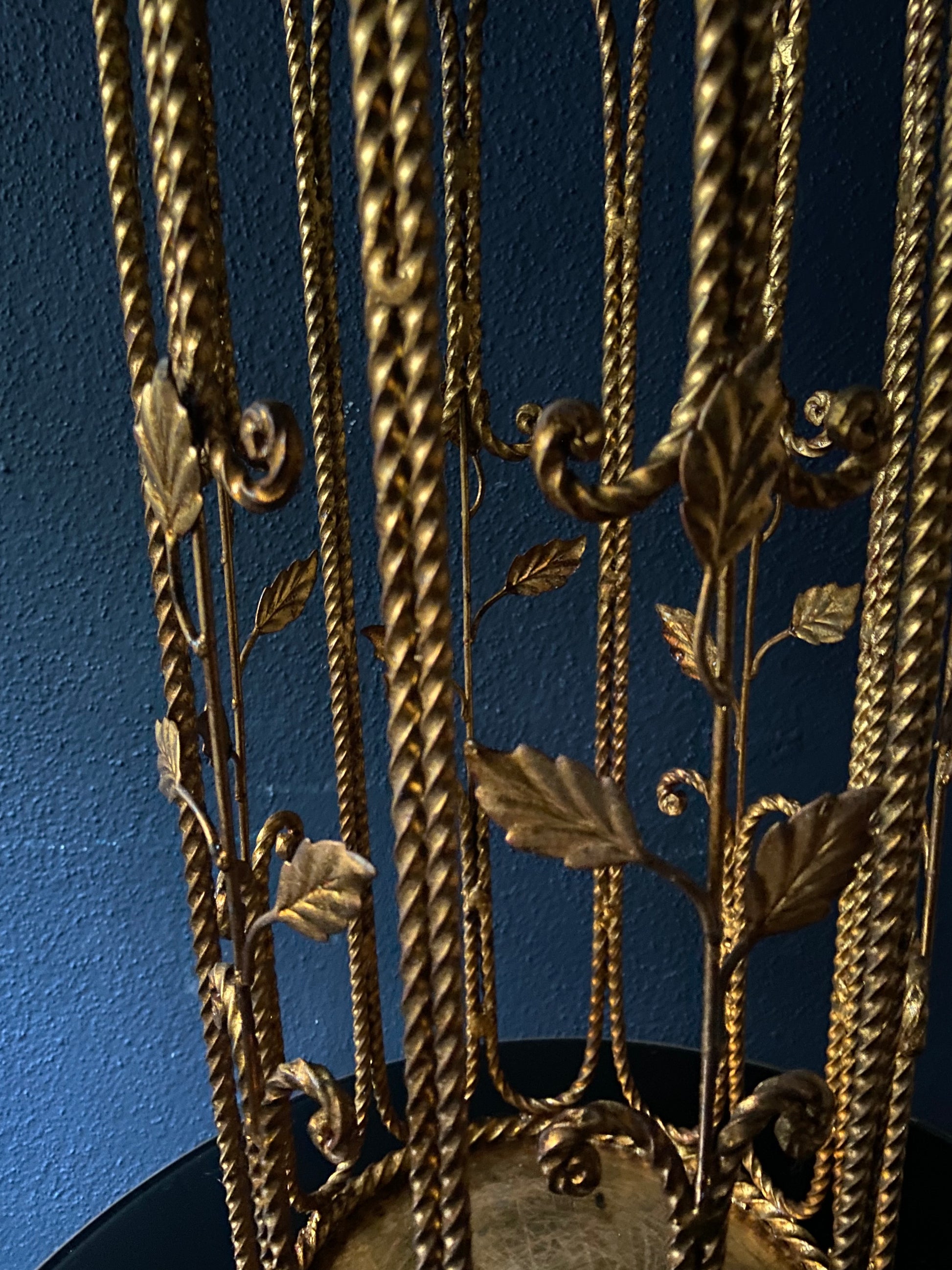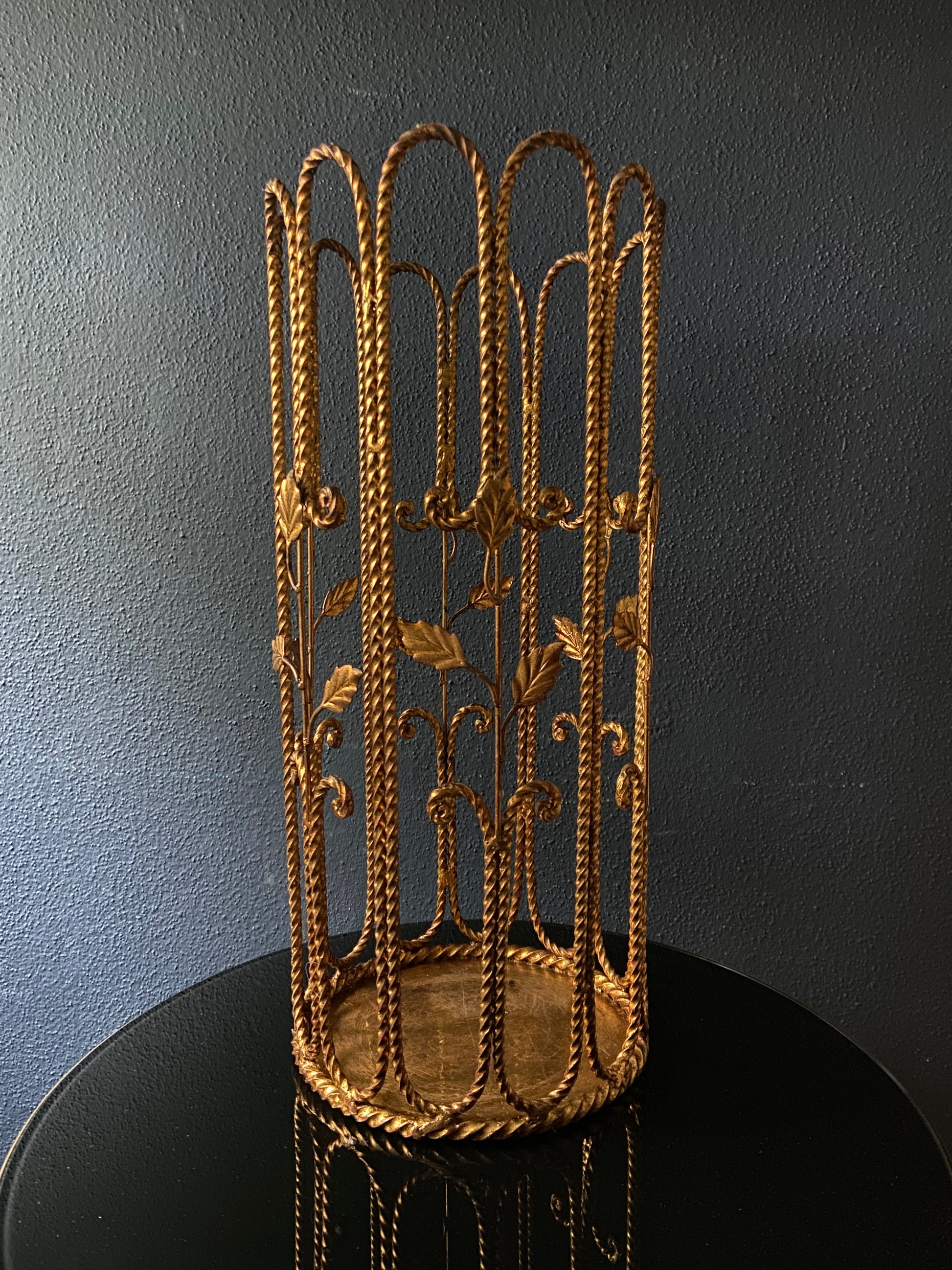 The stand is in good condition and the leaves have maintained their shine while the ropes show some patina which makes a great contrast. Despite its age and use as an umbrella stand there are no holes in the base tray.
