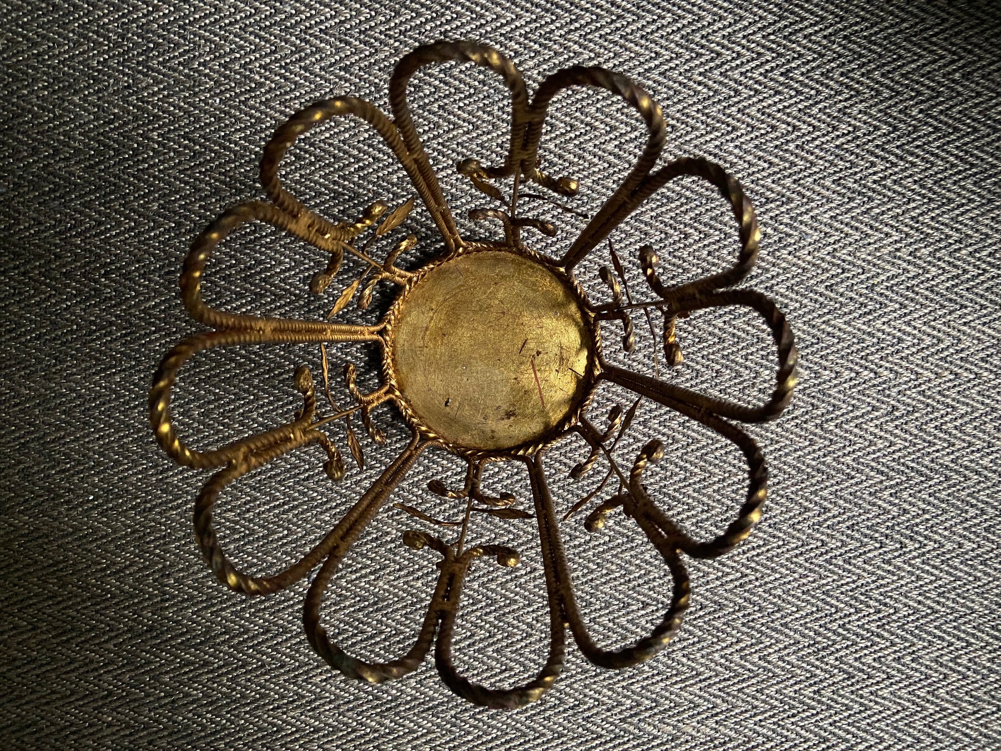 While there is no maker's mark, the twisted wrought iron ropes are reminiscent of the Italian designs in the 1960s - albeit maybe a little more Tuscan villa than Venetian palazzo.