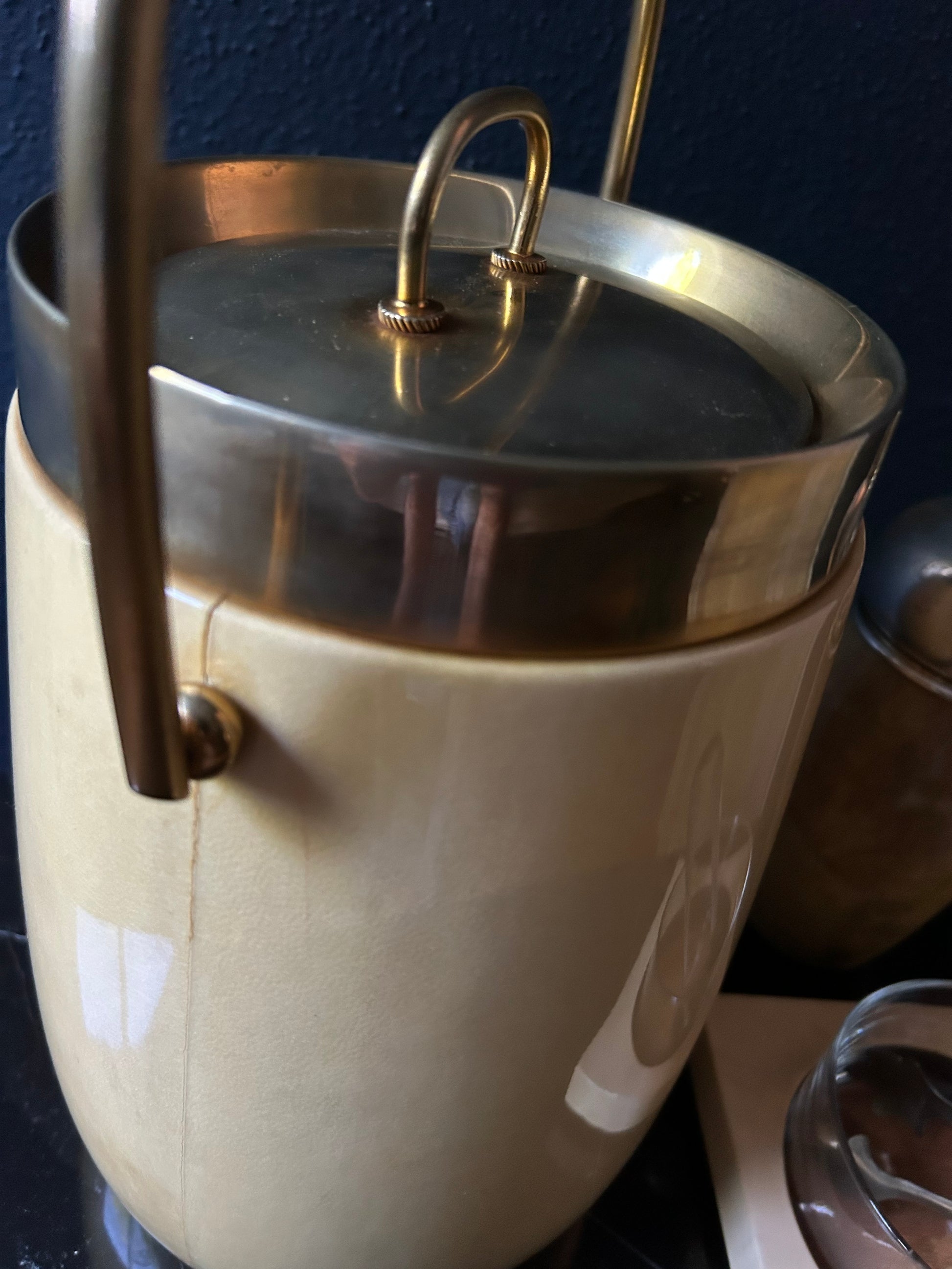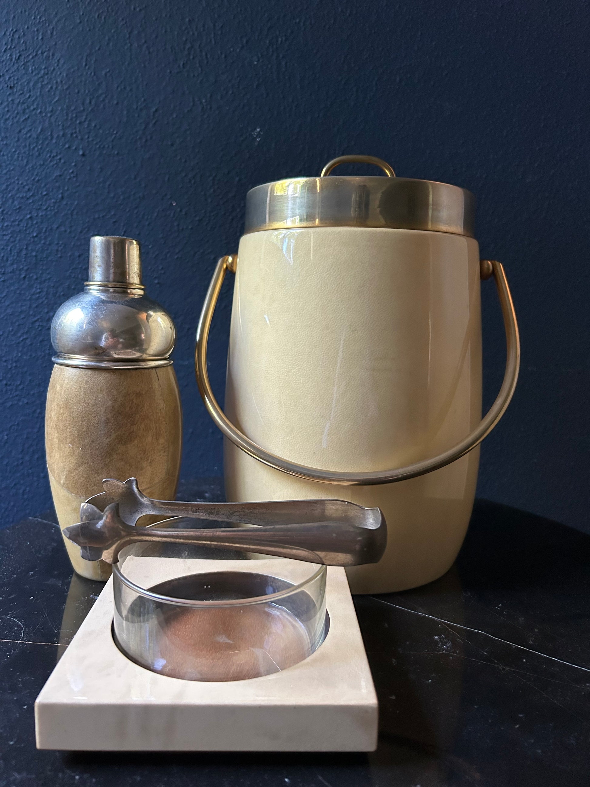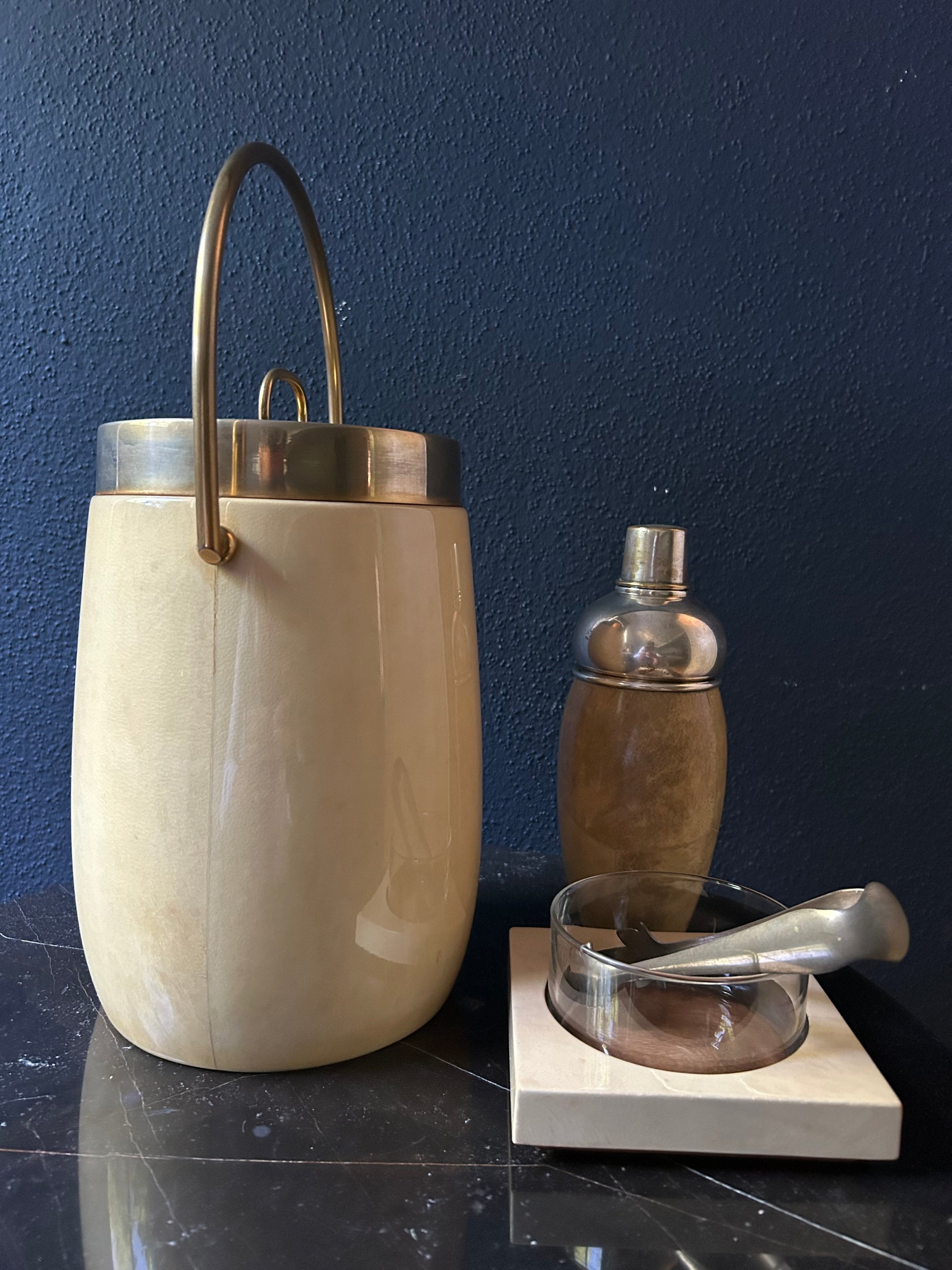 Add a touch of La Dolce Vita to your home bar with this neat 3 piece set by the Italian designer Aldo Tura, renowned for his lacquered goatskin bar carts and cabinets.