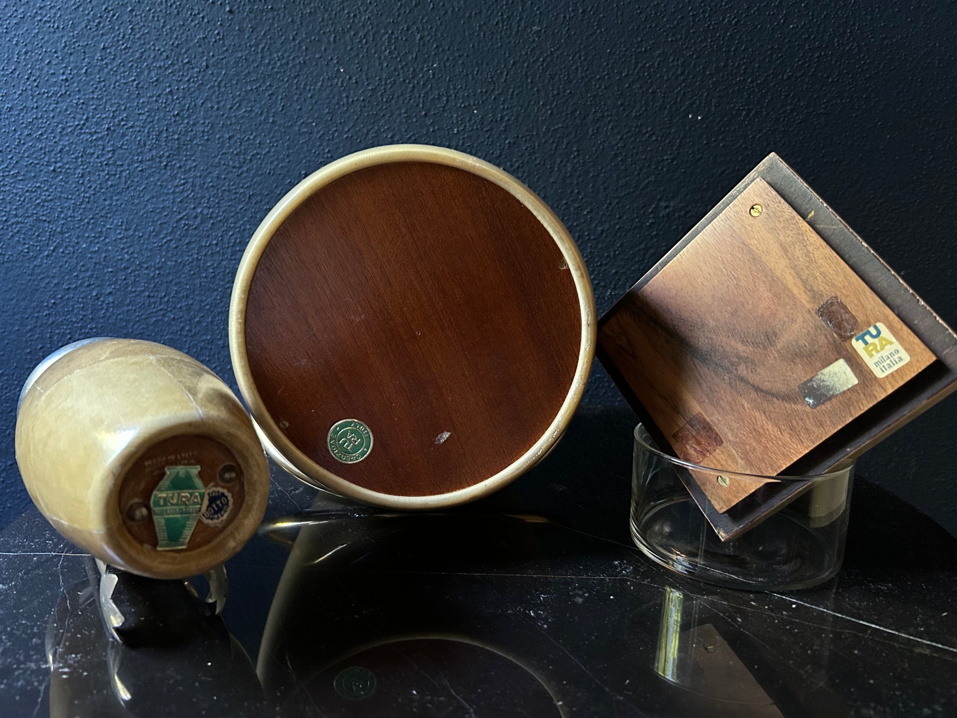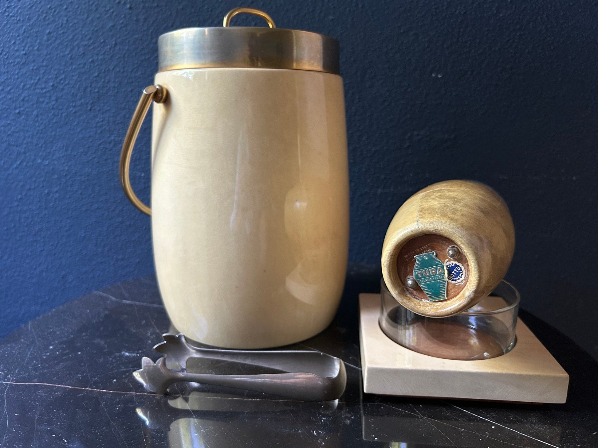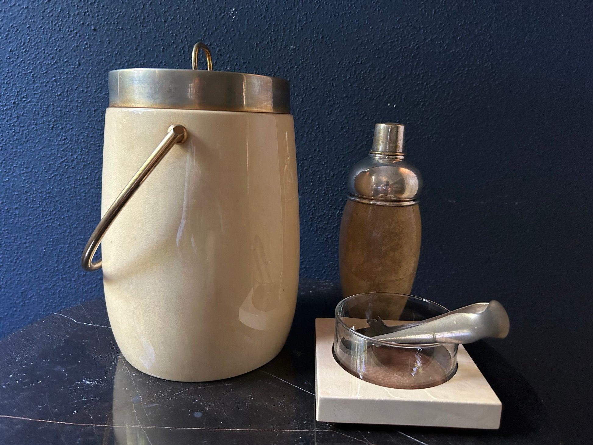 The shaker, bucket and serving bowl bases are all marked with the original Aldo Tura labels.
