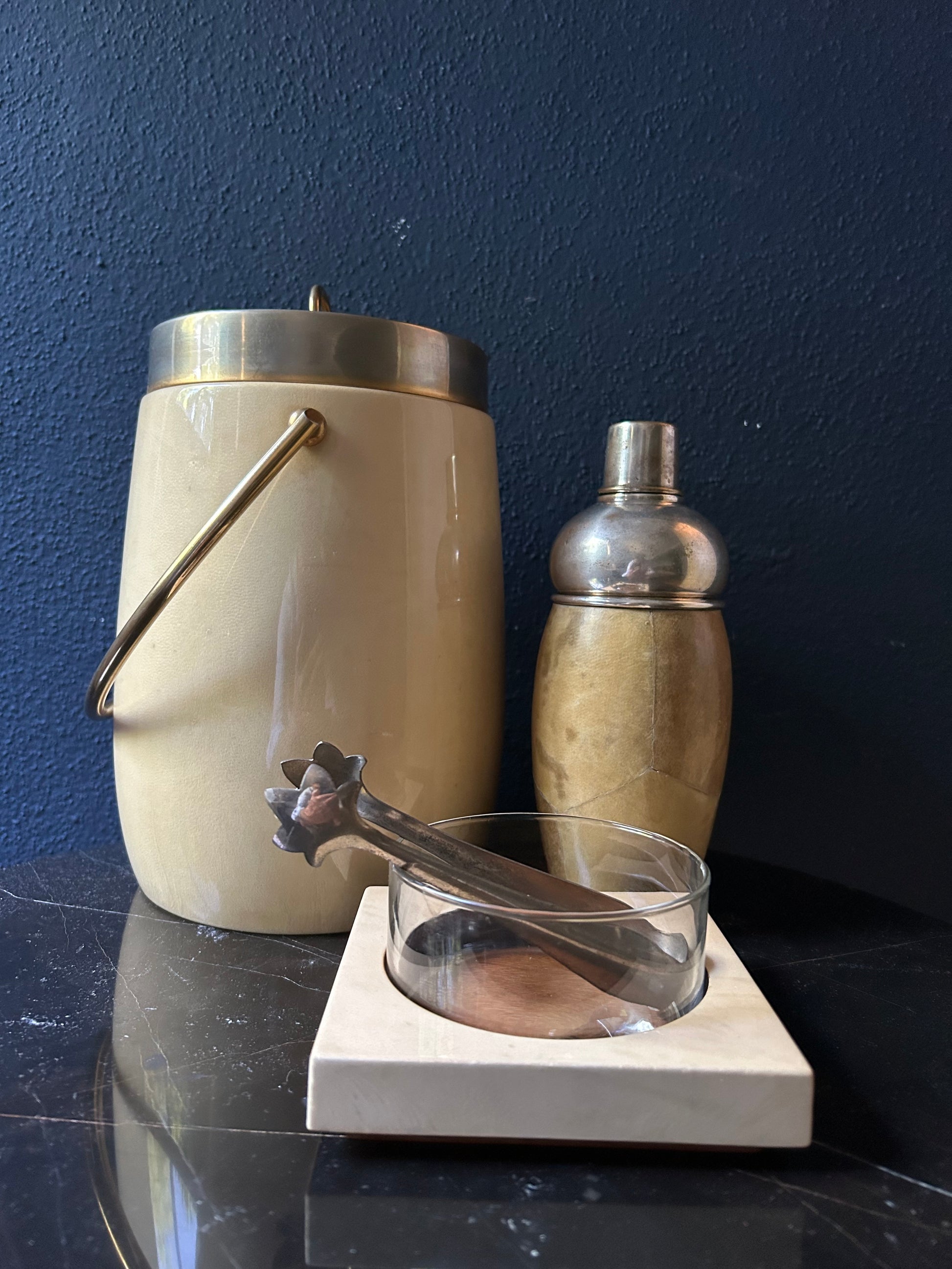 3 Piece Aldo Tura Barware Set with Ice Bucket, Shaker, Sugar Tong and Serving Bowl, Italy, 1970s