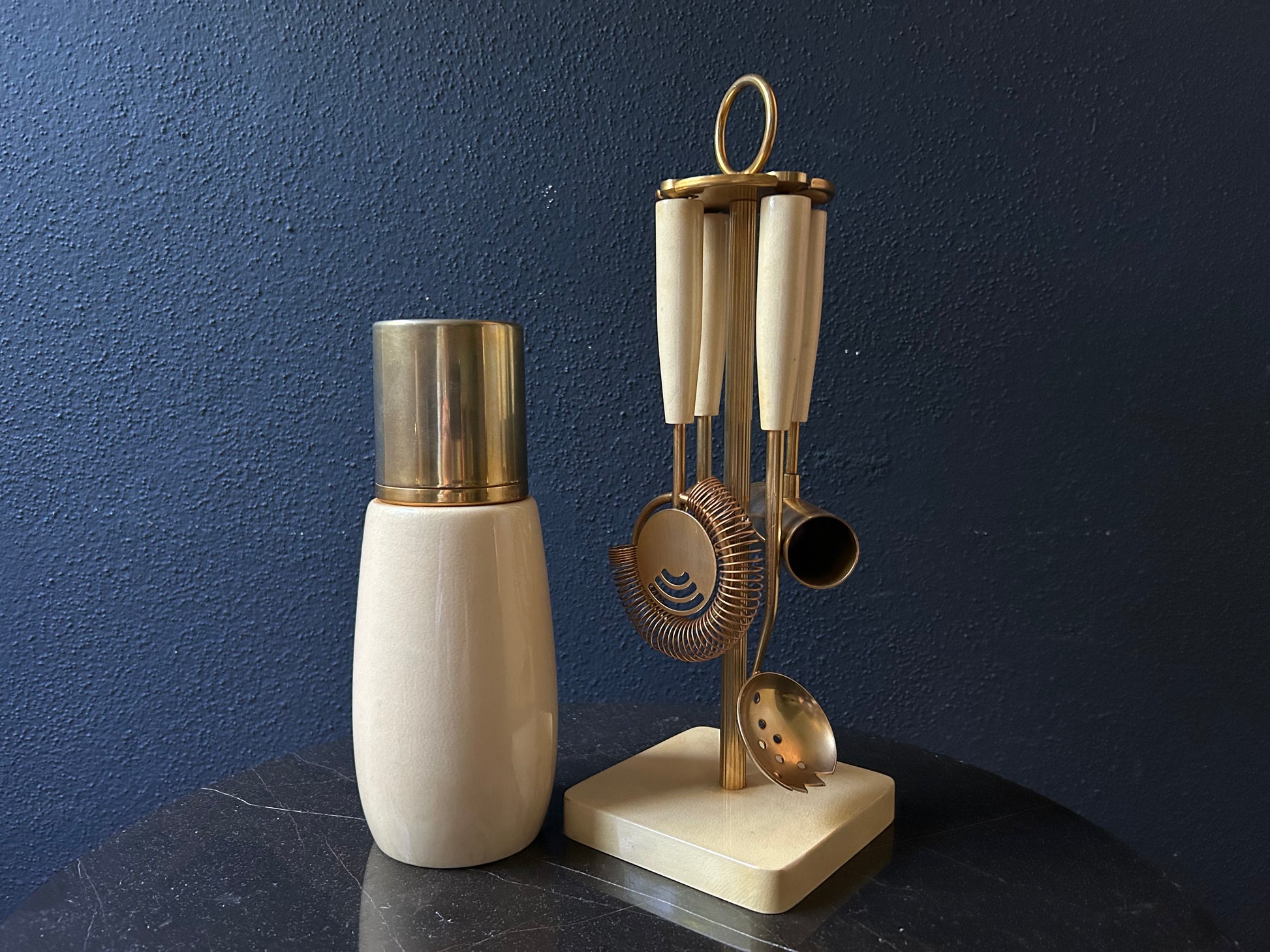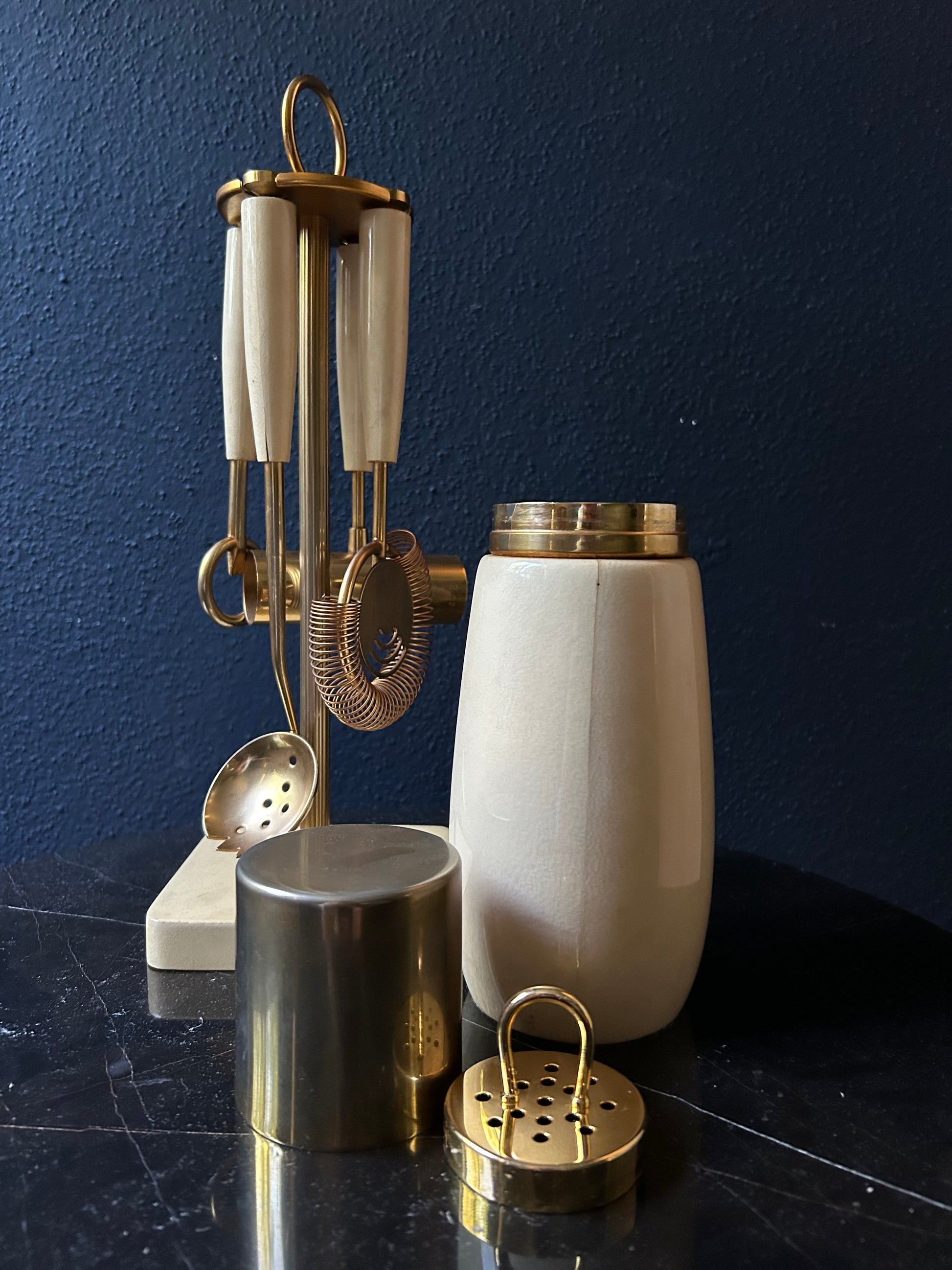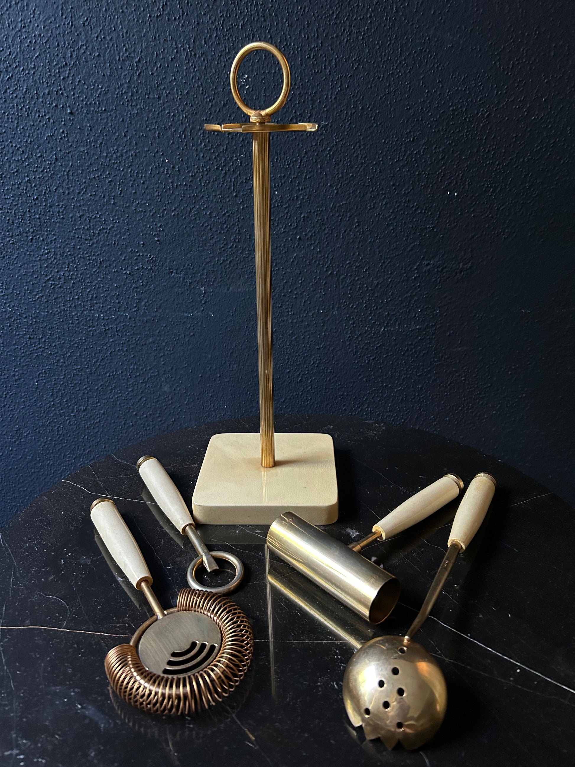 Also included in the set is a brass stand with matching pearl white base, allowing you to neatly store the utensils when not in use. The base still has the original Aldo Tura sticker attached.