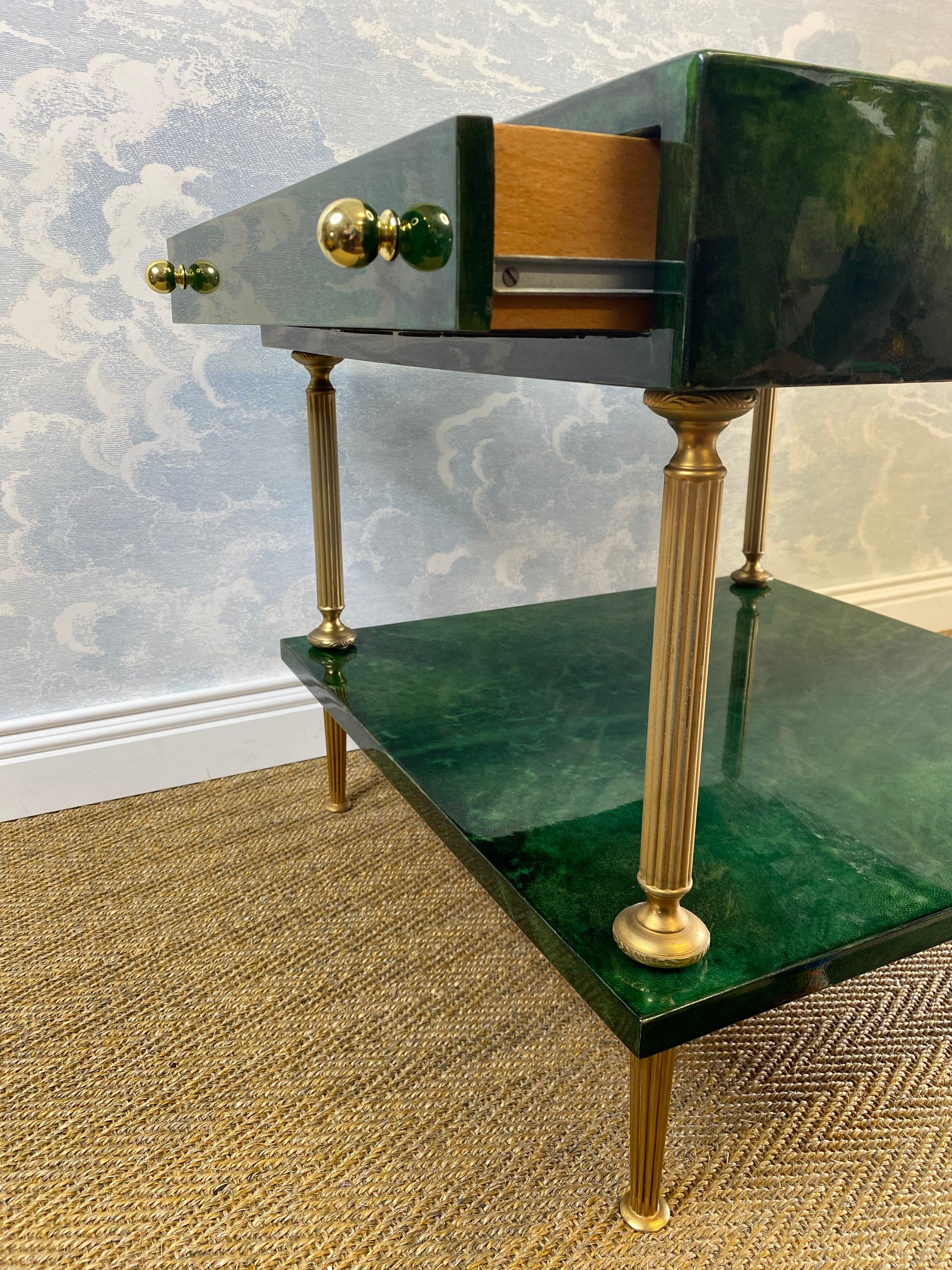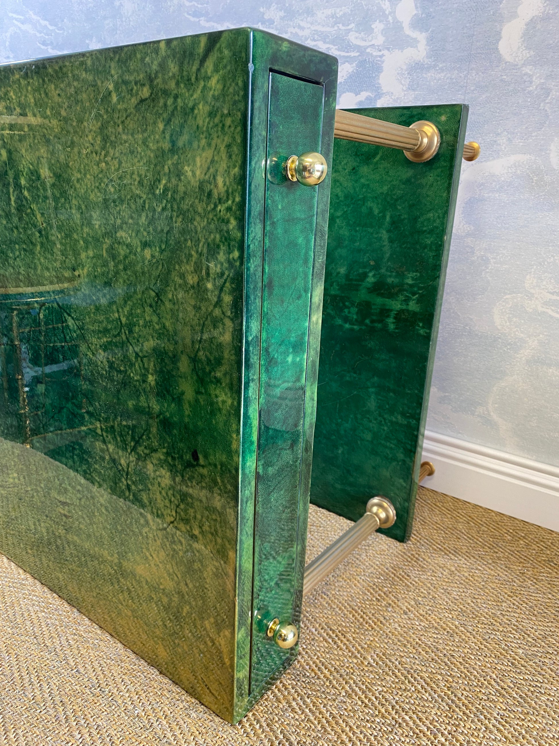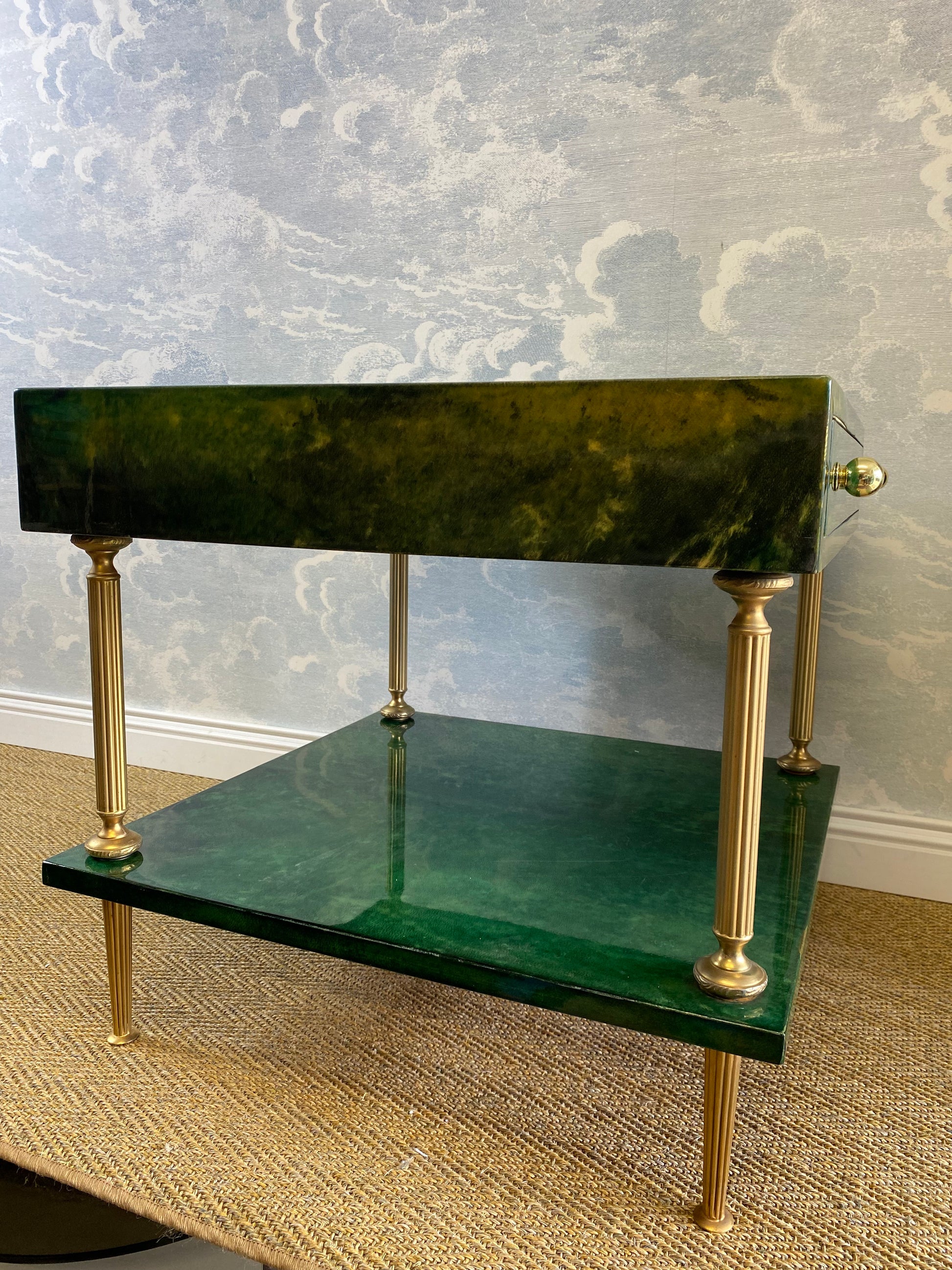 Set on four brass legs, the brass frame supports two surfaces which are covered in an emerald green lacquered goatskin.