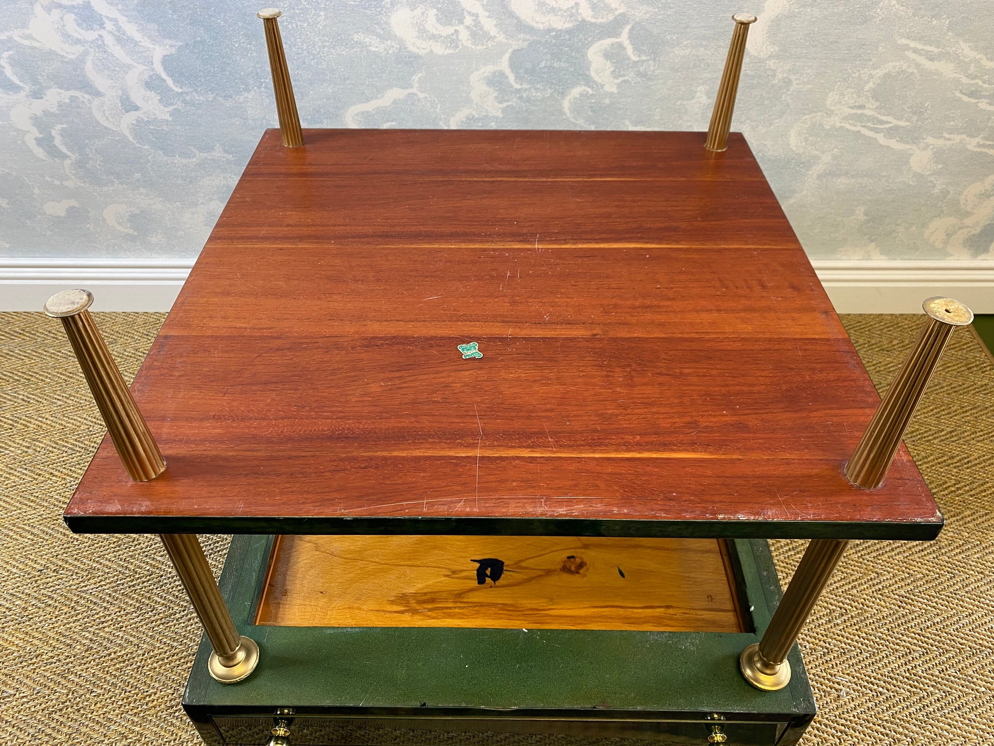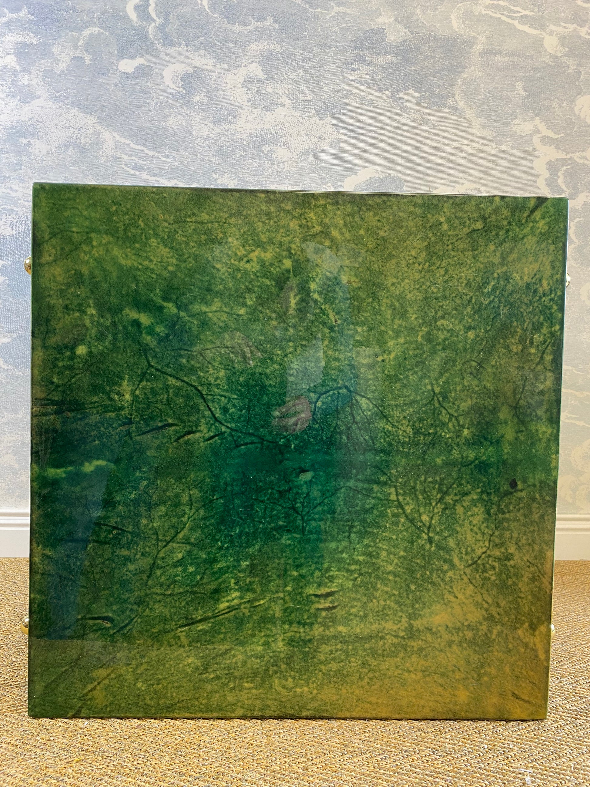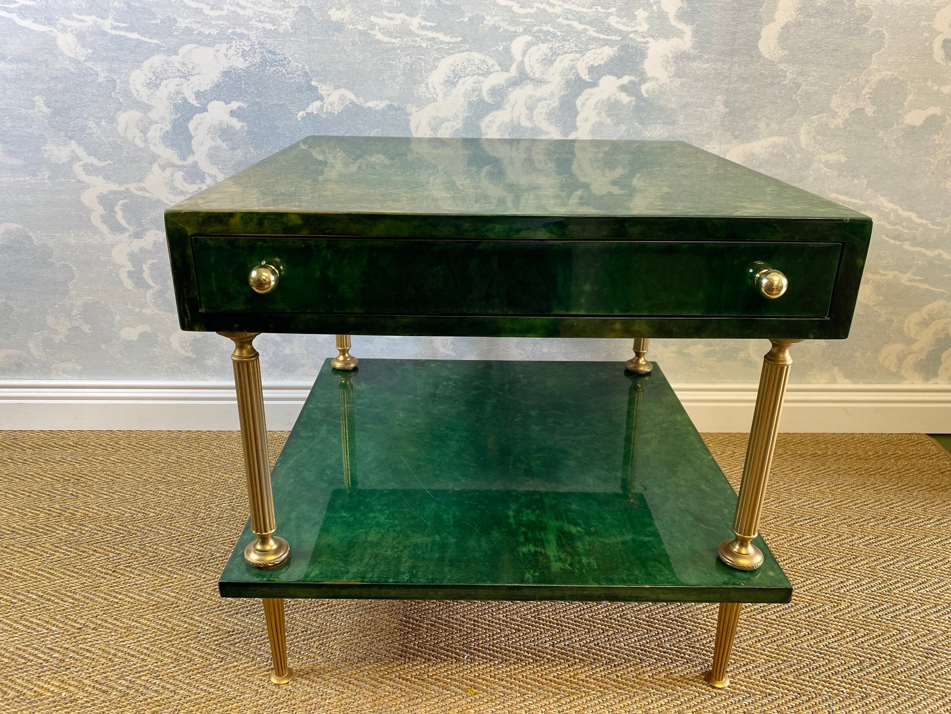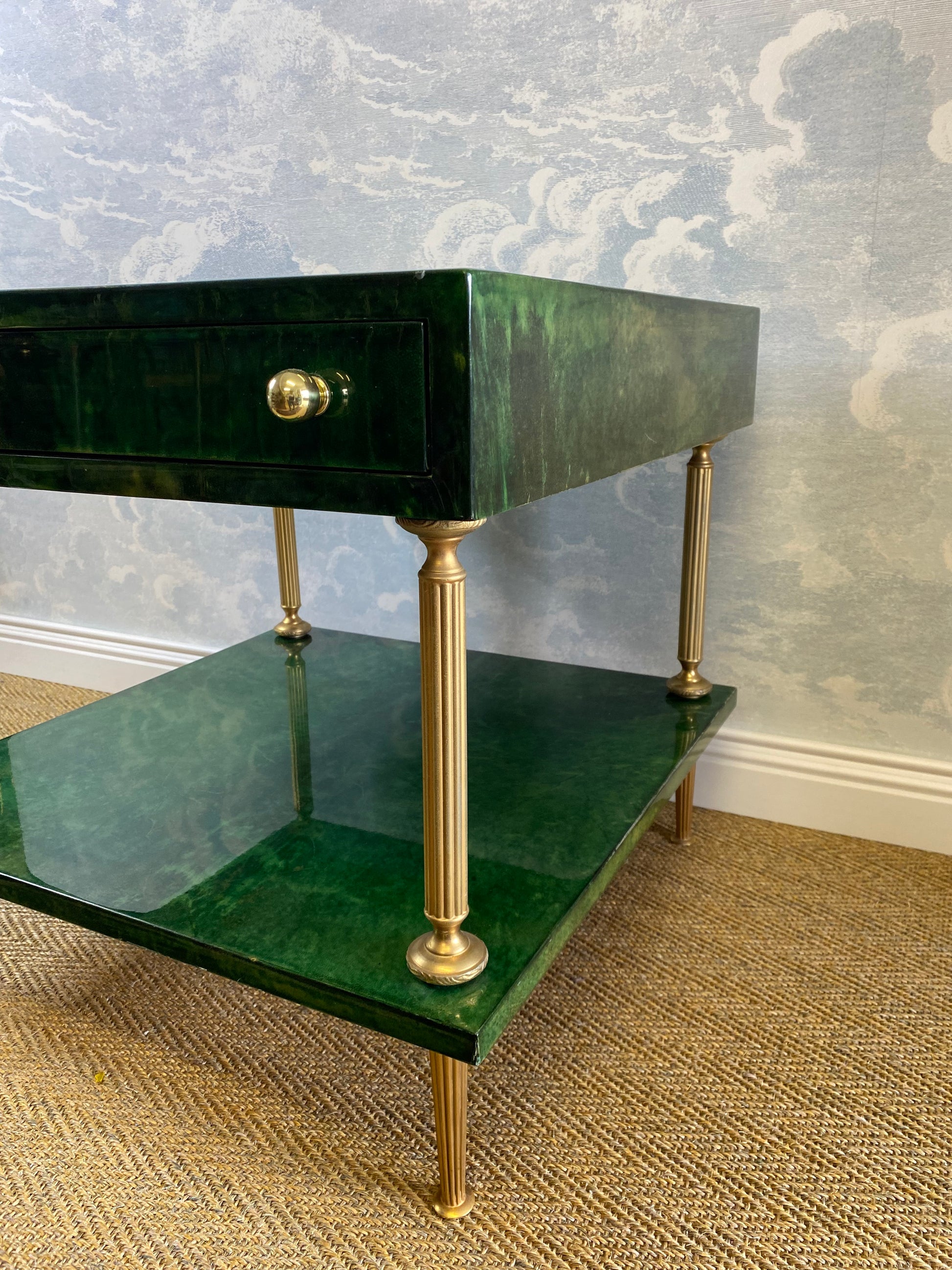 Set on four brass legs, the brass frame supports two surfaces which are covered in an emerald green lacquered goatskin.