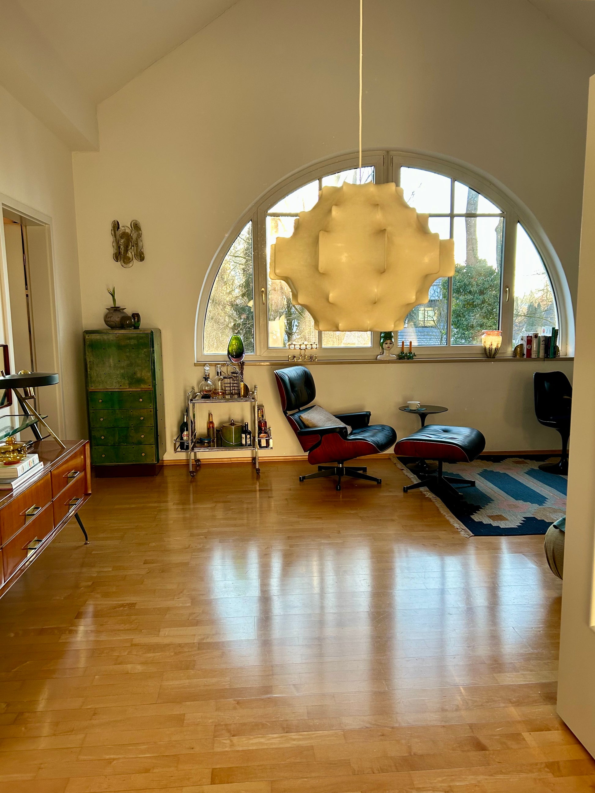 Often attributed and very close to the designs of Achille & Pier Giacomo Castiglioni. In fact this cocoon was manufactured in Germany bei “ Goldkant Leuchten between 50s and 60s . Designer Fritz Wauer who is credited by FLOS for devising the technology of spraying the self wrapping foam onto metal frames. Just like Silk worms constructing their cocoon. After that innovation this was brought to the established Italian FLOS Designers like Carlo & Tobia Scarpa, Dino Gavina and of course to Achille & Pier Giacomo Castiglioni. This makes these Goldkant models the original predecessor to later cocoon lamps.