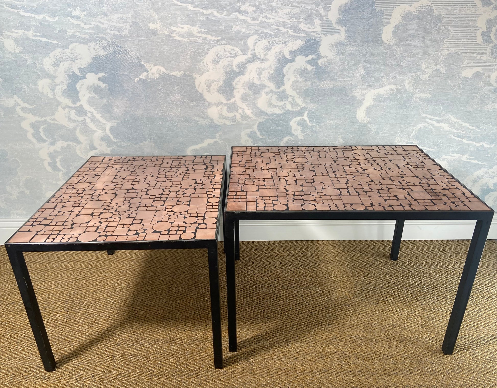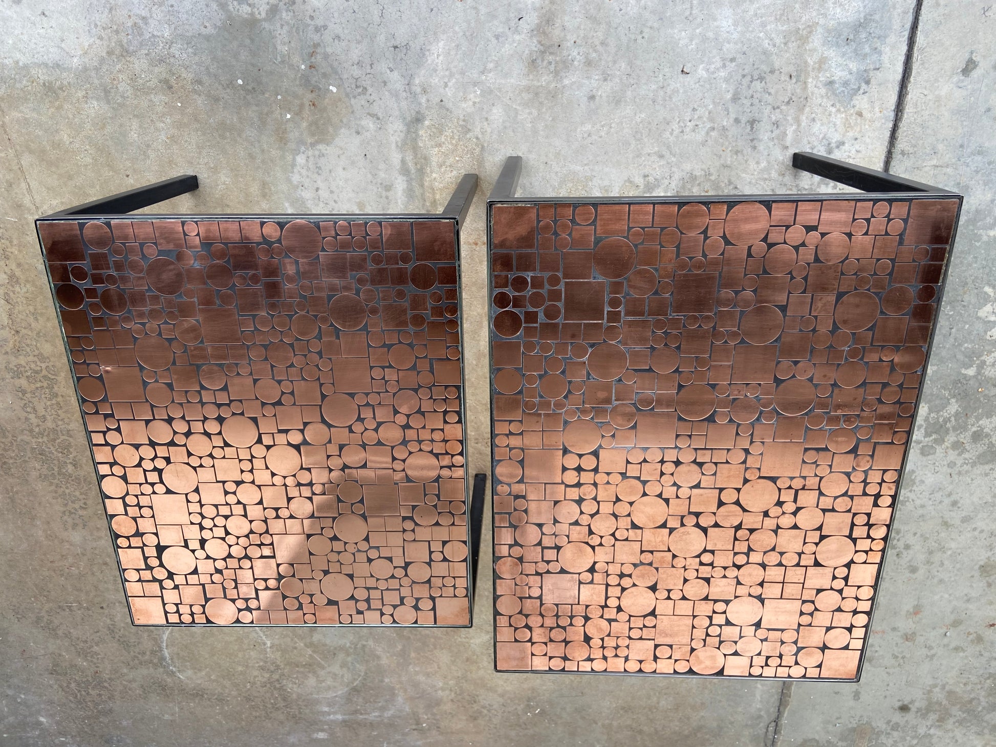The shiny table tops are composed of different sized copper circles and squares, which have been arranged "randomly" to form mesmerizing mosaics and sit on black metal frames.