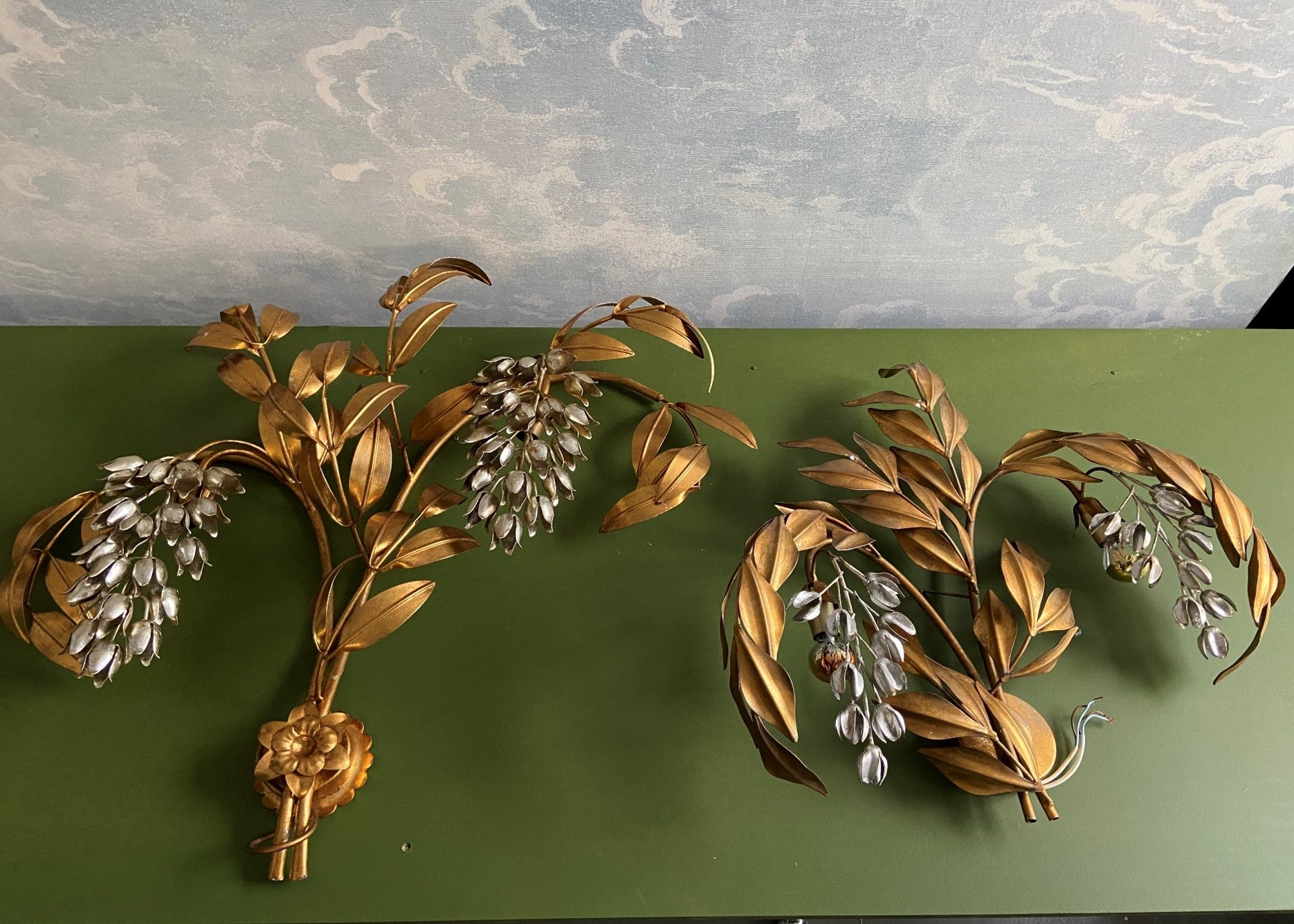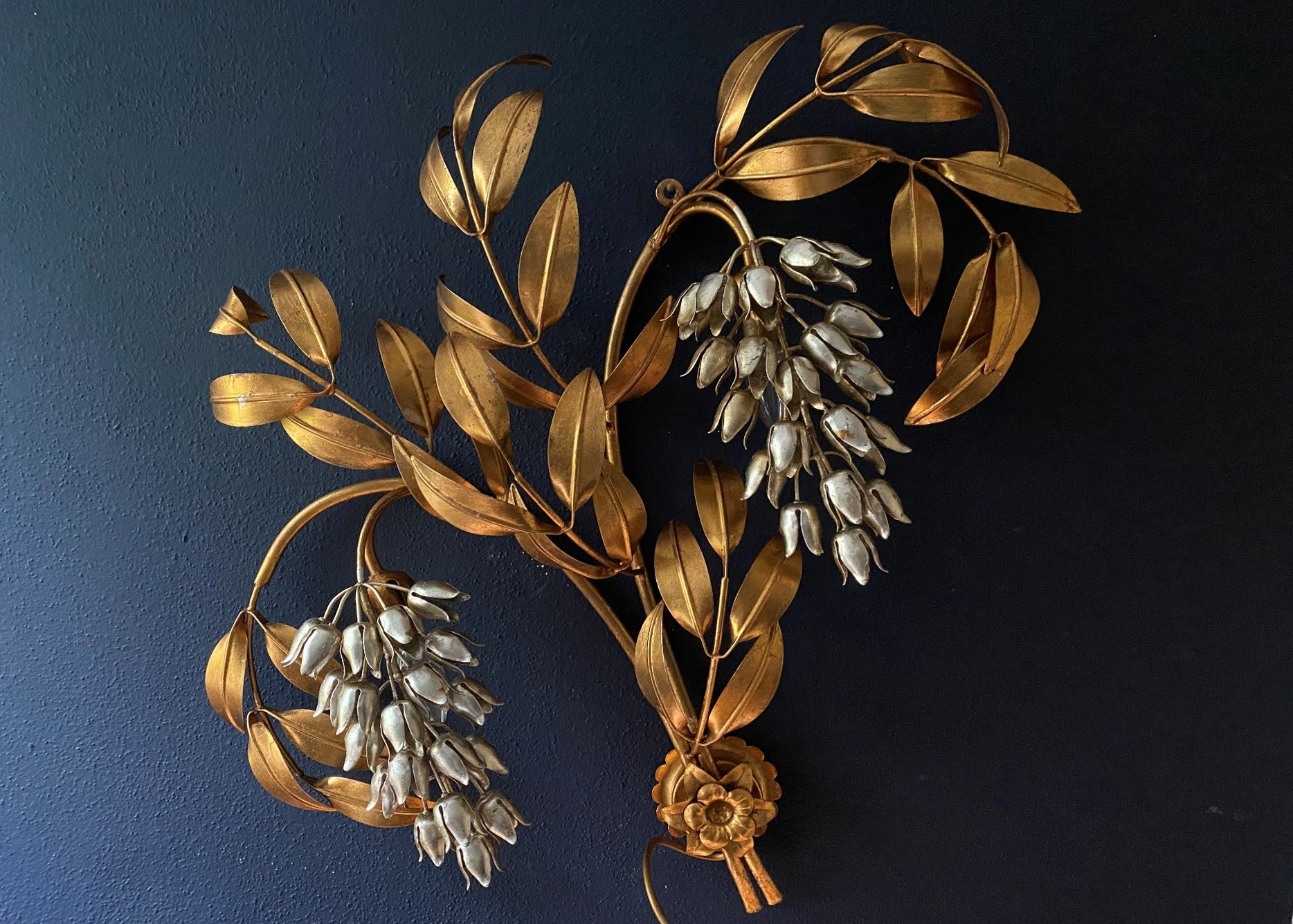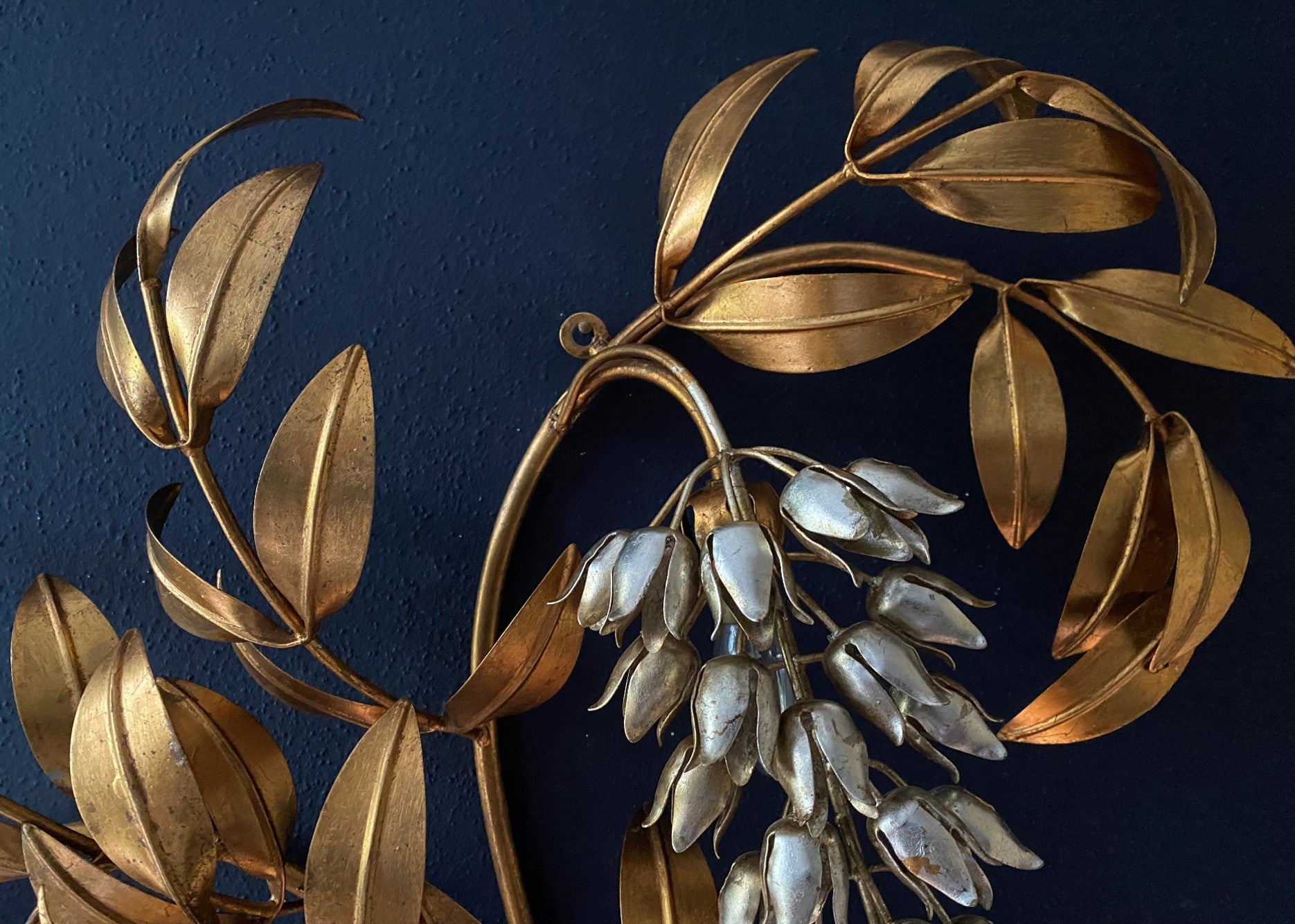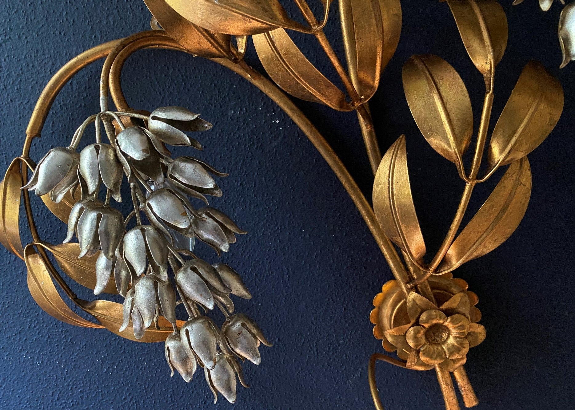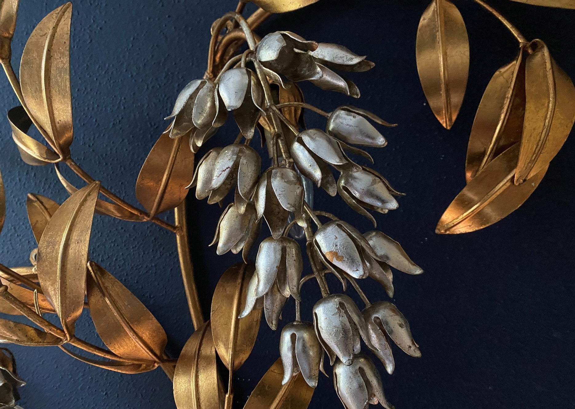 A beautiful light fixture featuring gold leaves & silver leaves, it has 4 sockets for small base screw bulbs or LEDs within the blooms.
