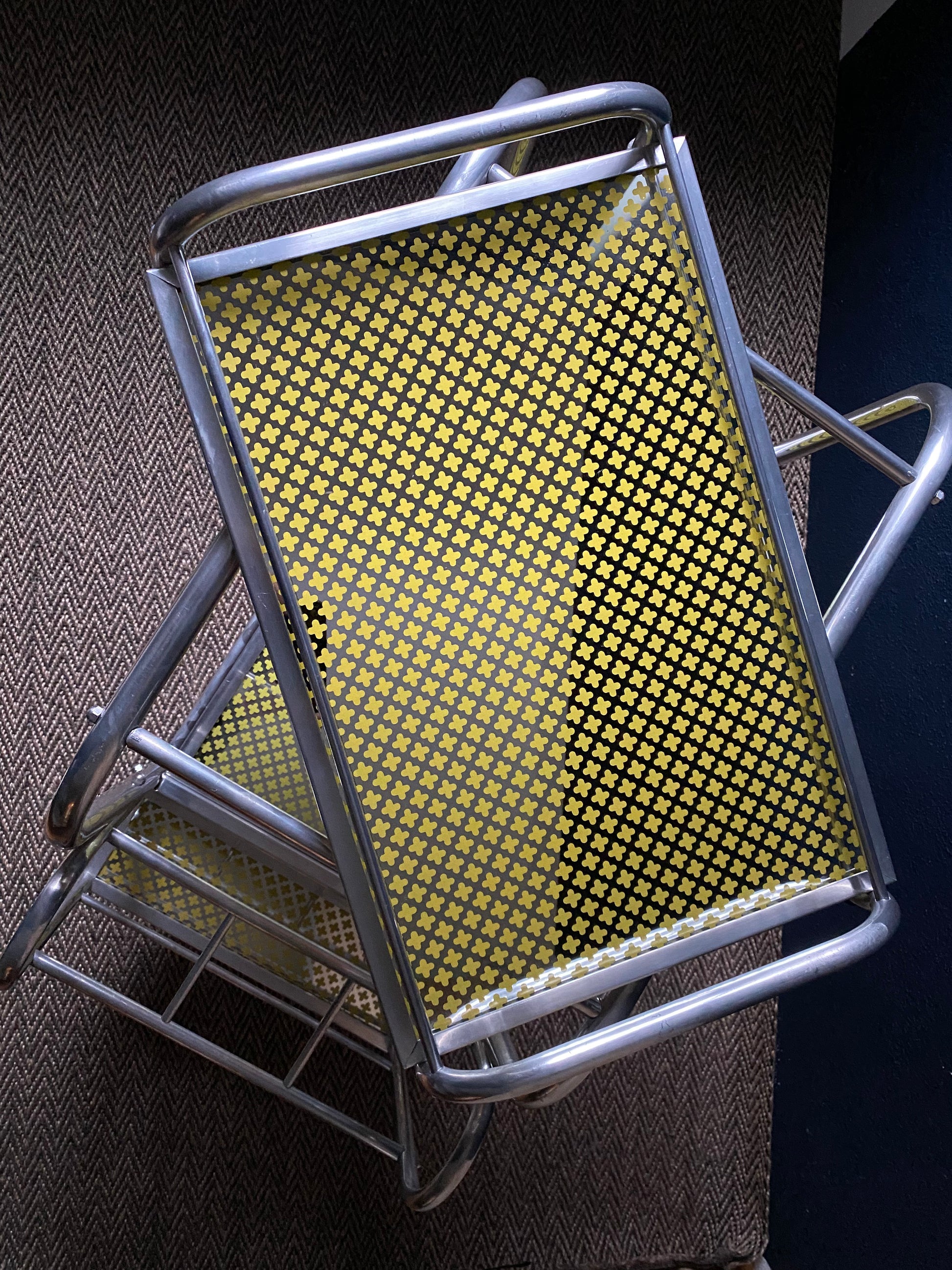 This eye-catching Art Deco aluminum framed bar cart hails from France in the 1940s and is attributed to Jacques Adnet.