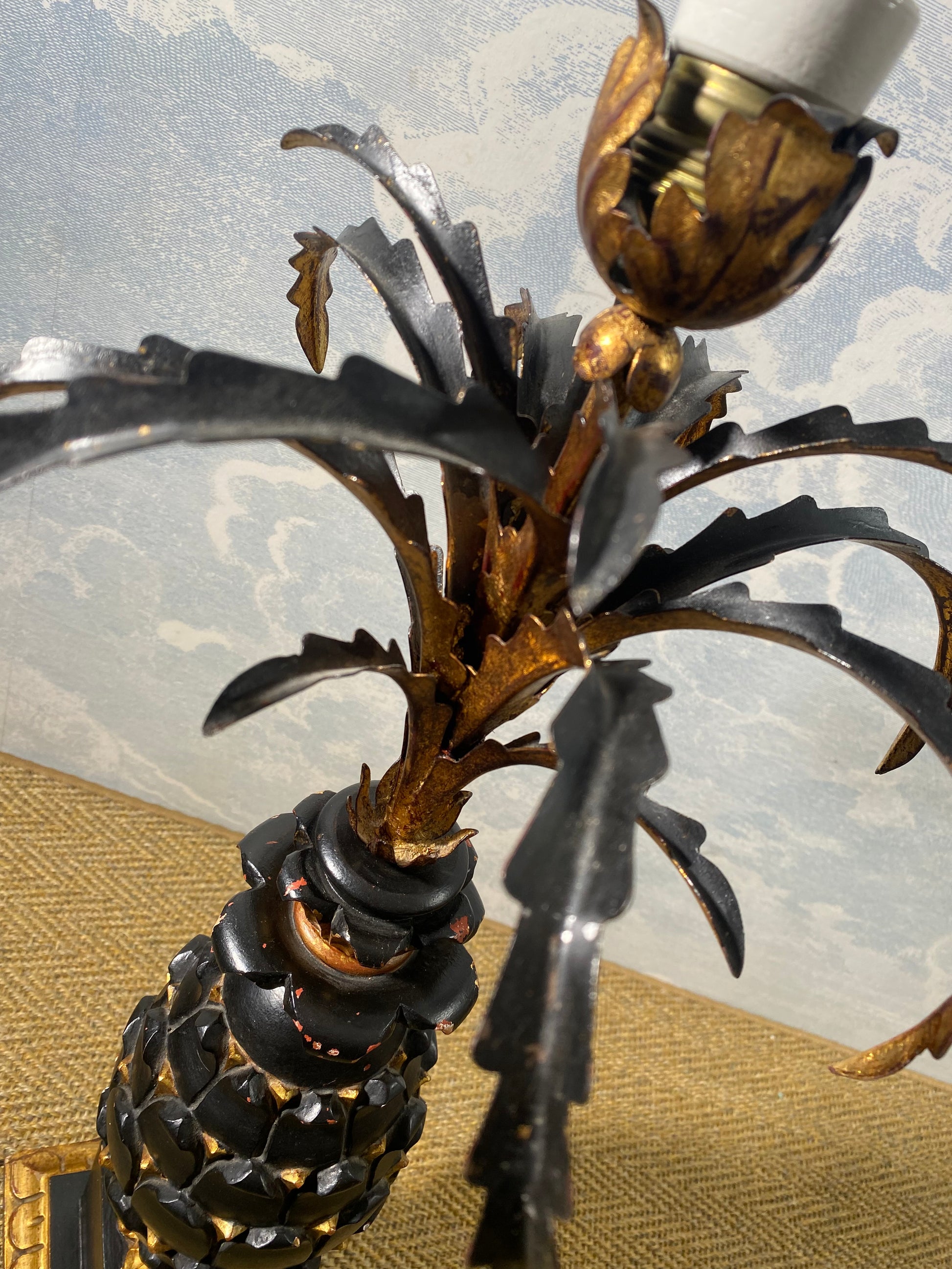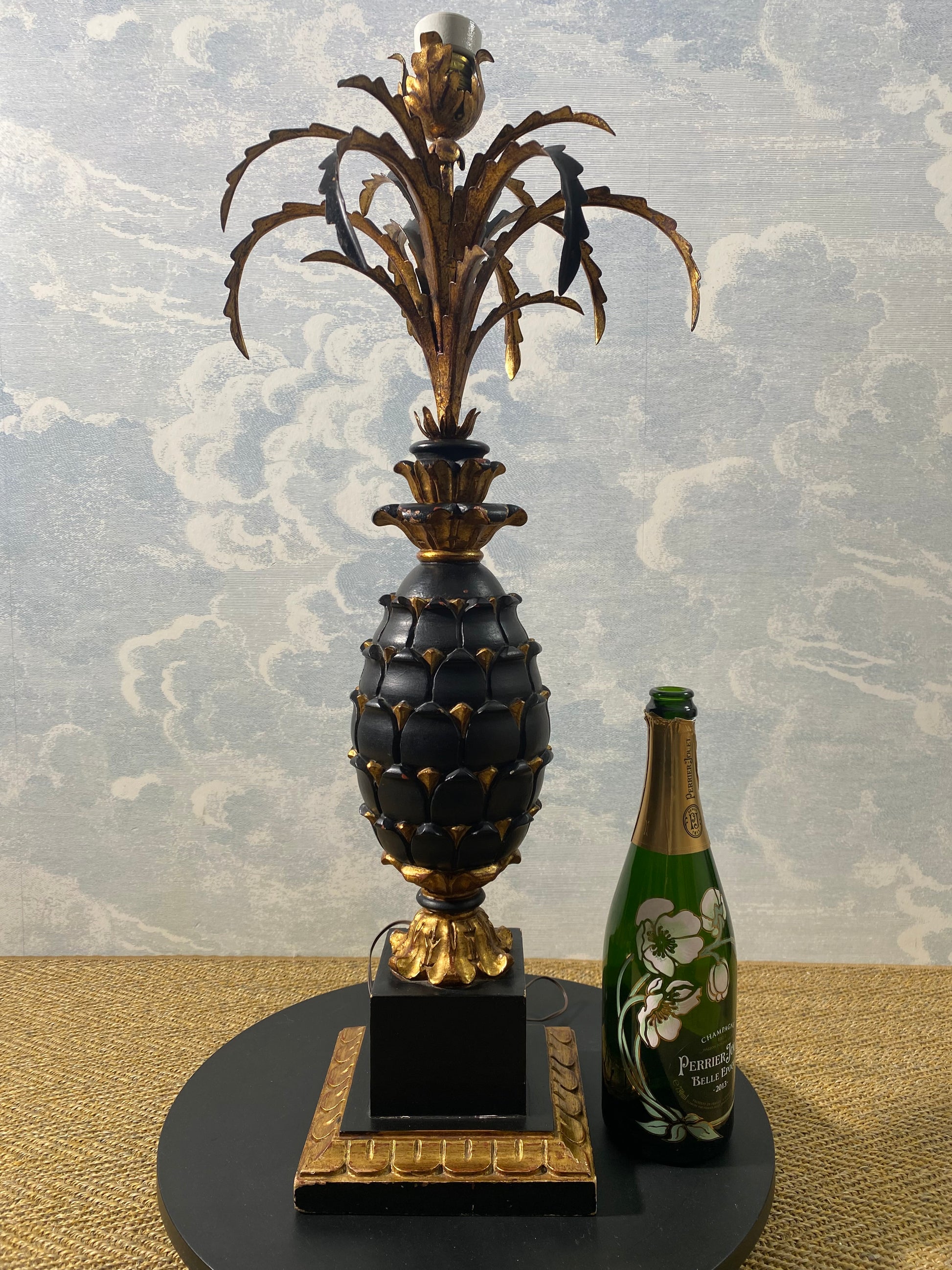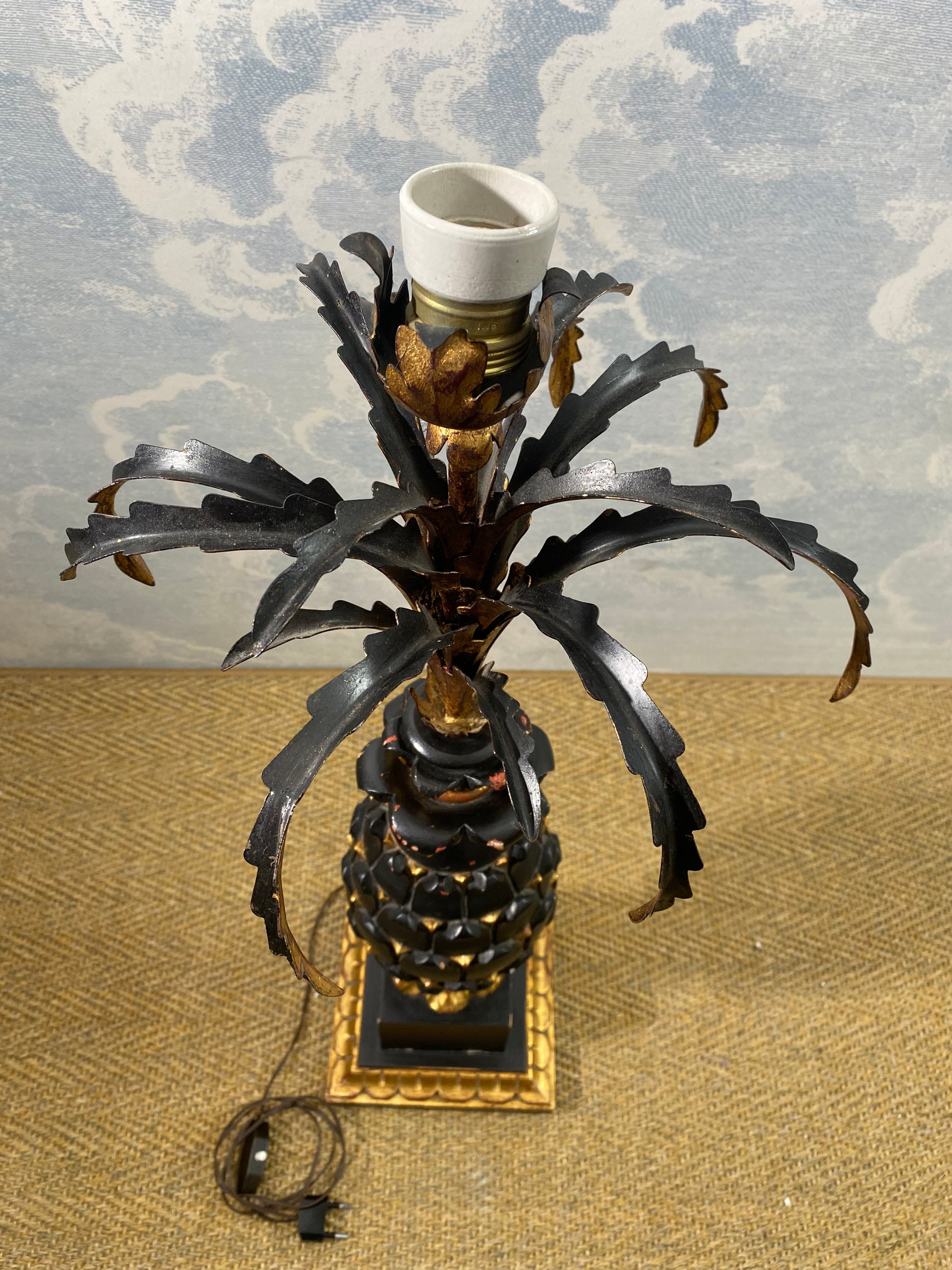Raised on a square base and decorated in black and gold this rather large light fixture exudes sophisticated confidence. The pineapple crown consist of gilt metal leaves from which the central rod rises culminating in a flower calyx holding the lightbulb socket.