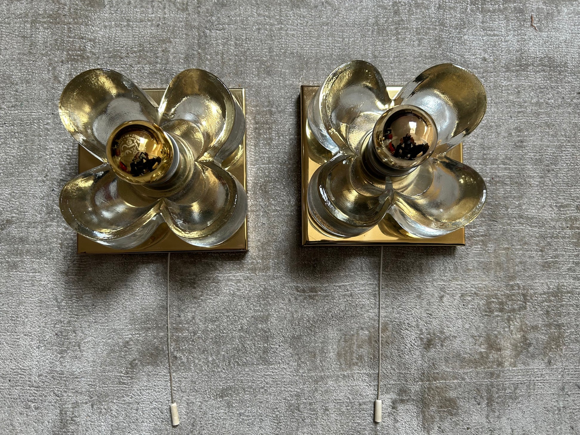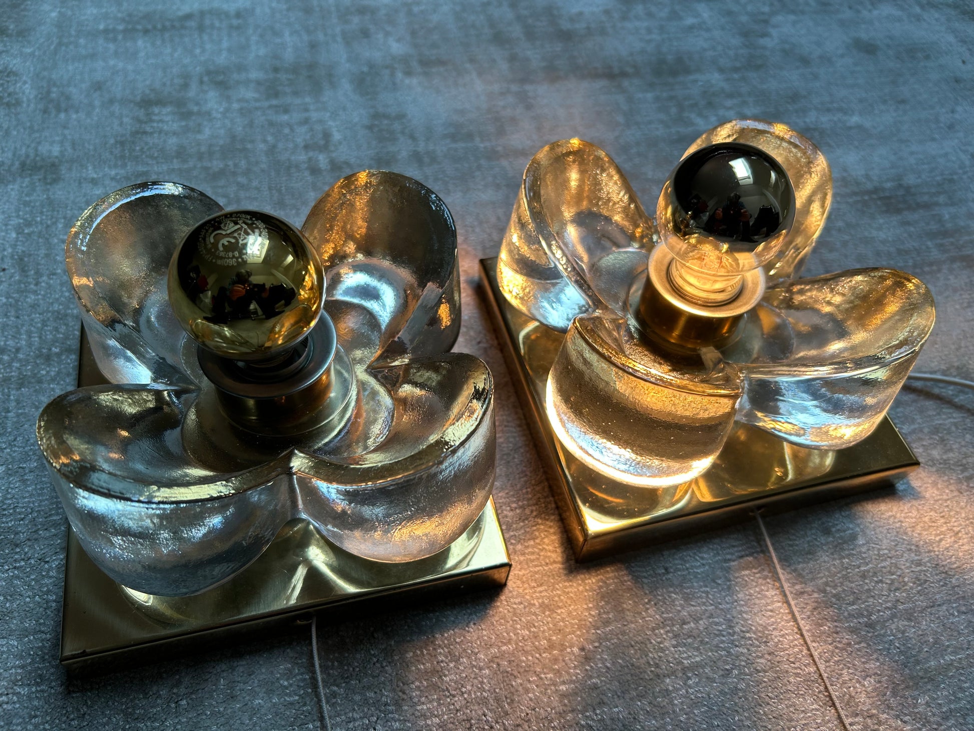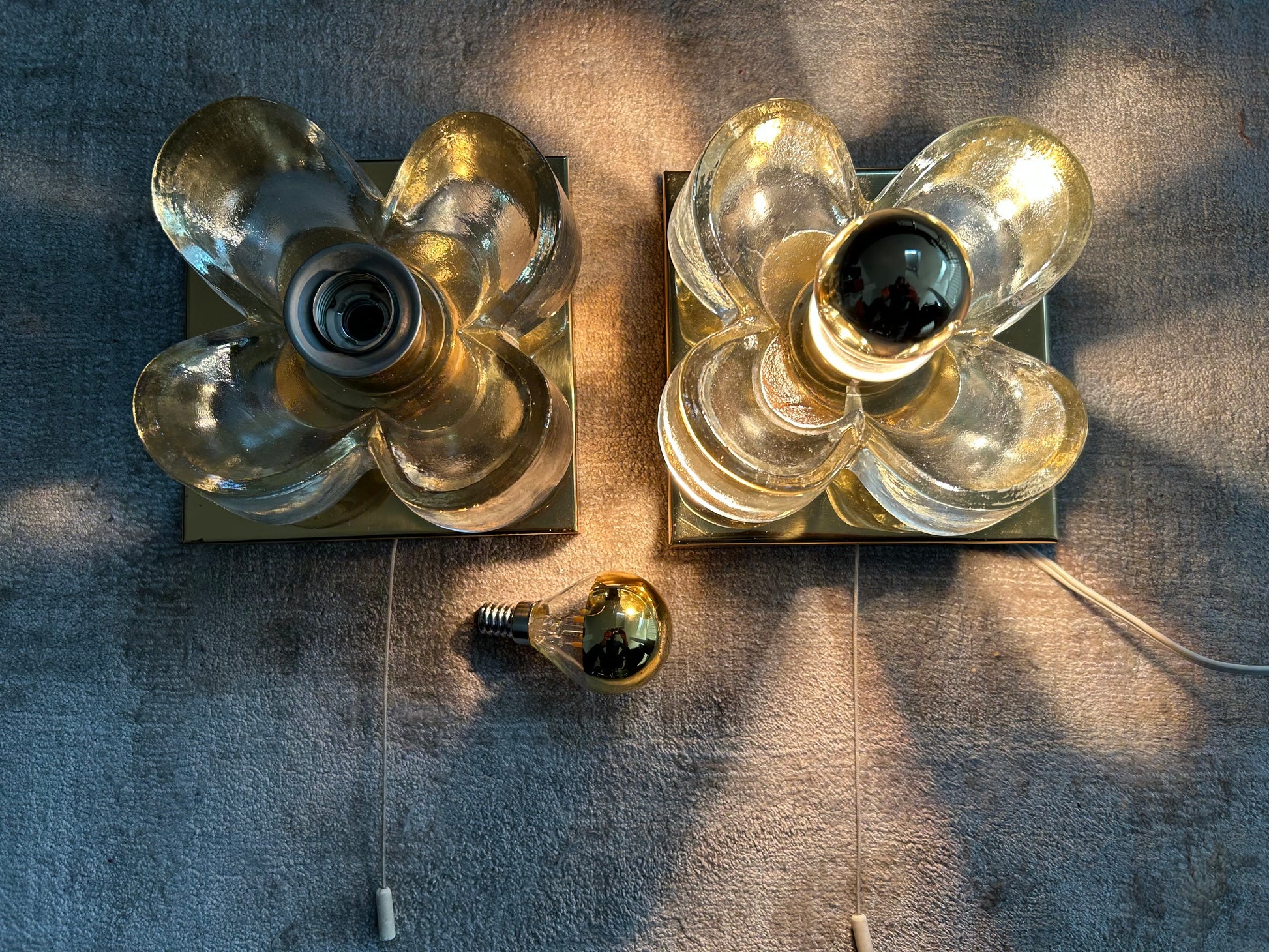 The pair was designed and made by Simon & Schelle (SiSCHE) in Germany in the mid-1970s and emits a soothing warm light thanks to brass reflecting through the thick crystal-glass flowers. Different effects are achieved by using different light bulbs - gold mirrored bulbs having the best effect in our opinion.