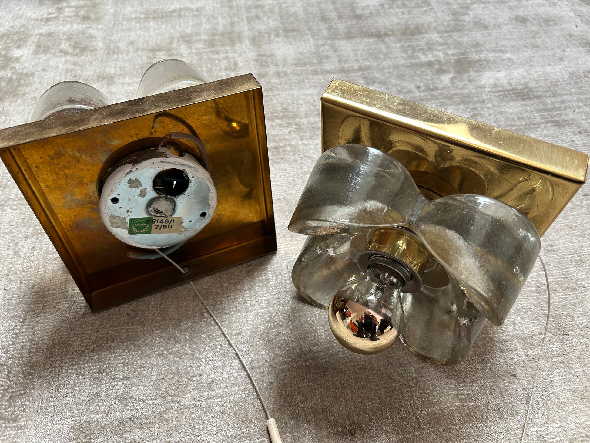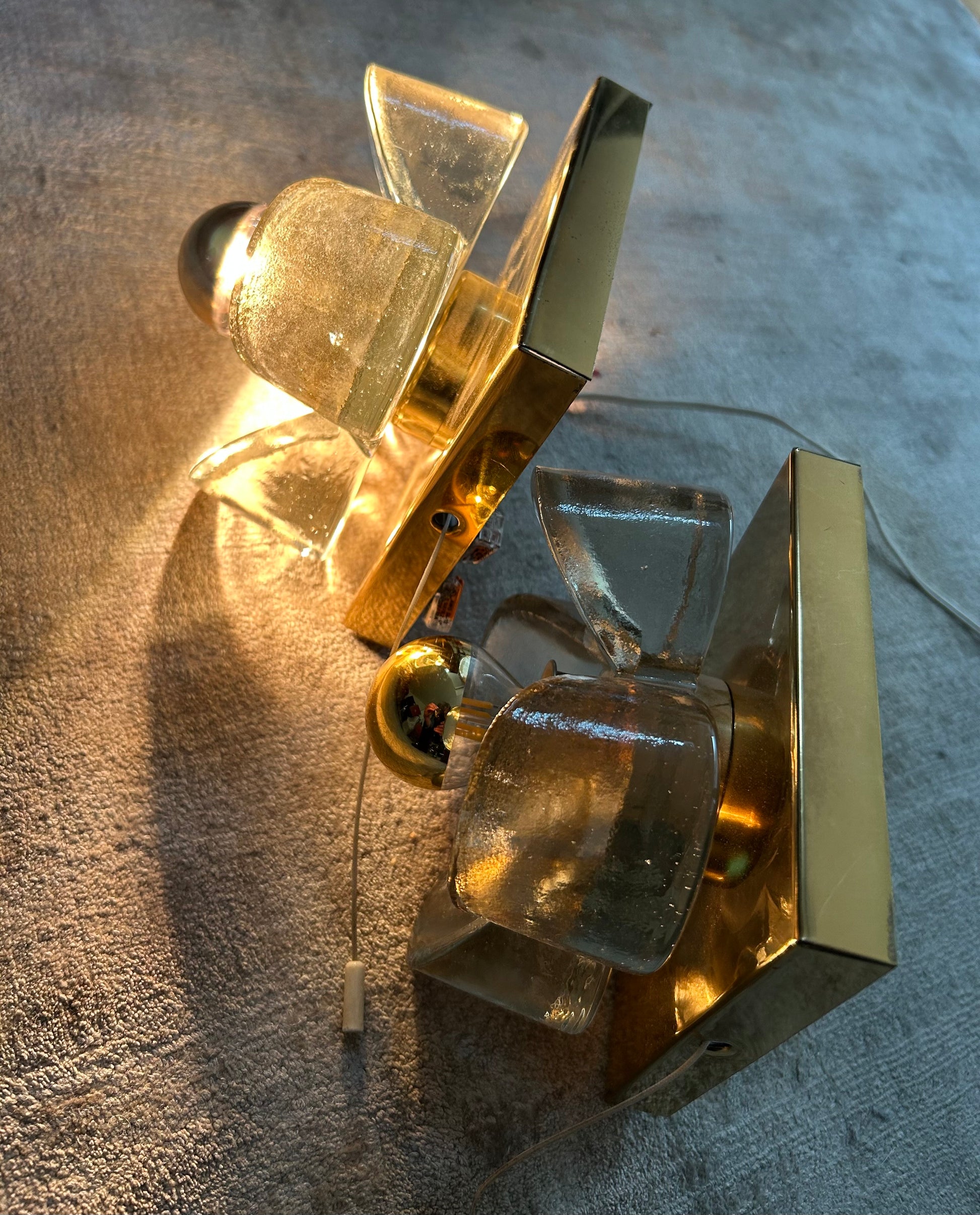 Set on brass mounts, this pair of high-end crystal-glass wall lights oozes with Mid-Century Modern luxury!