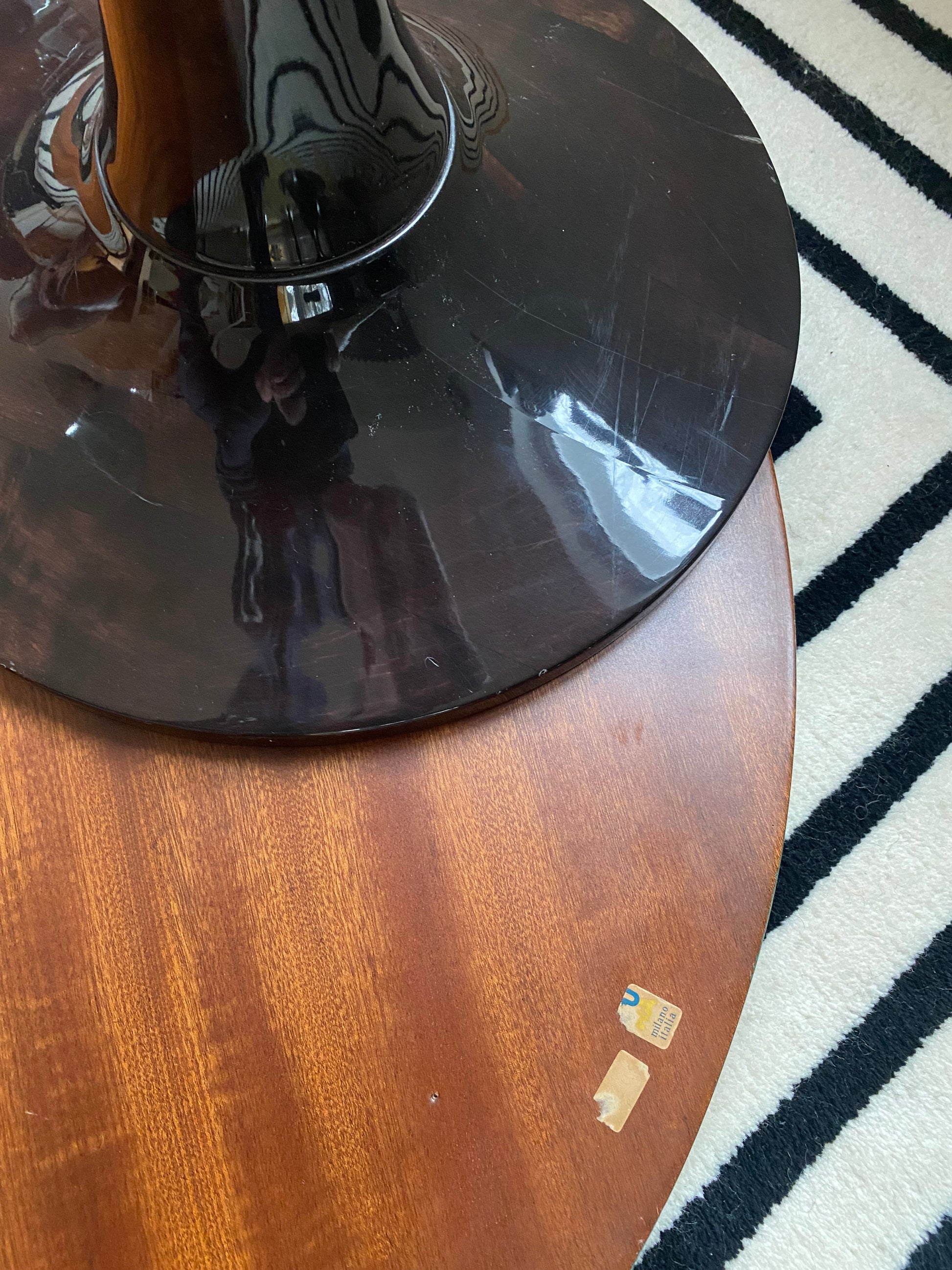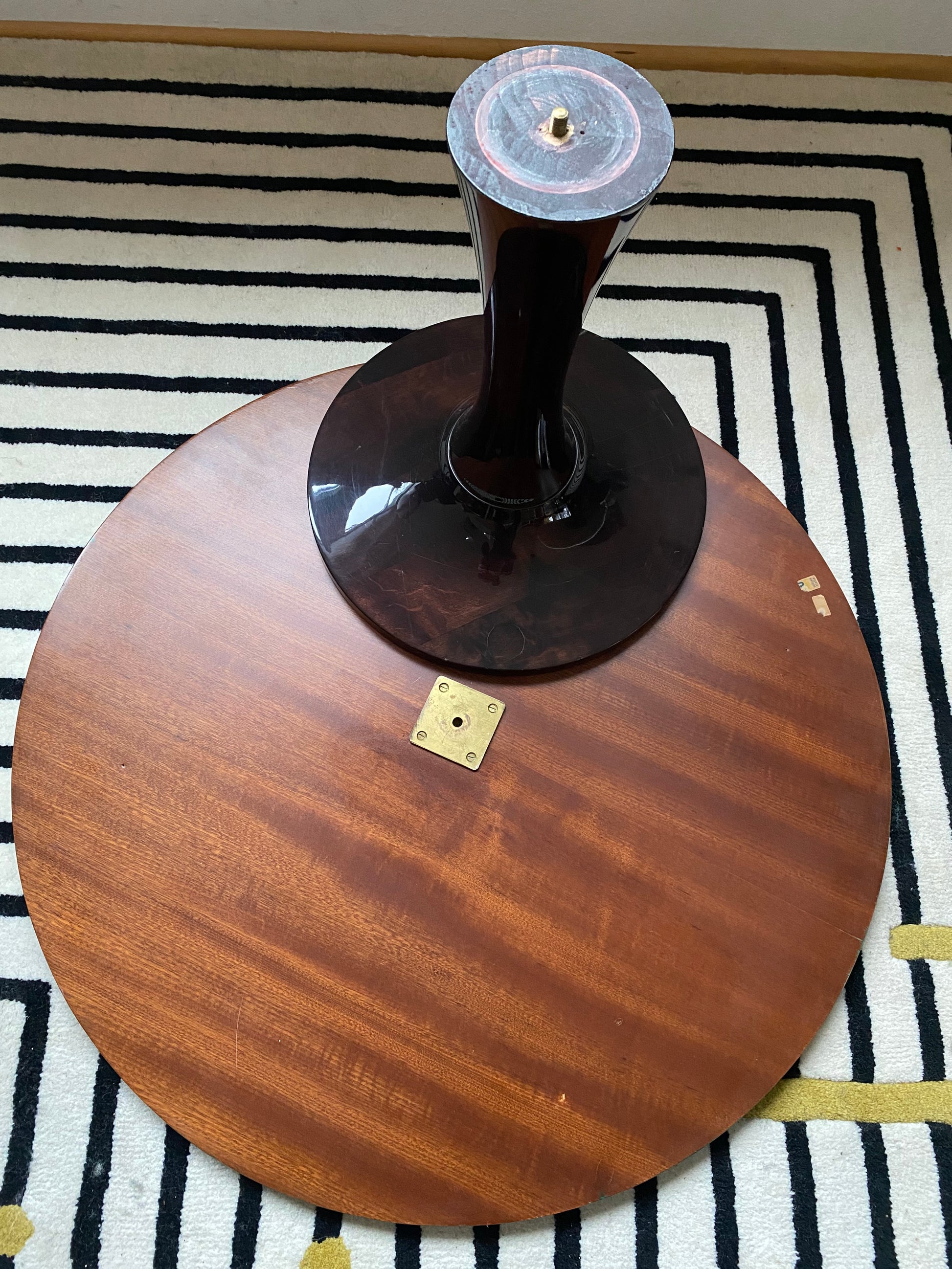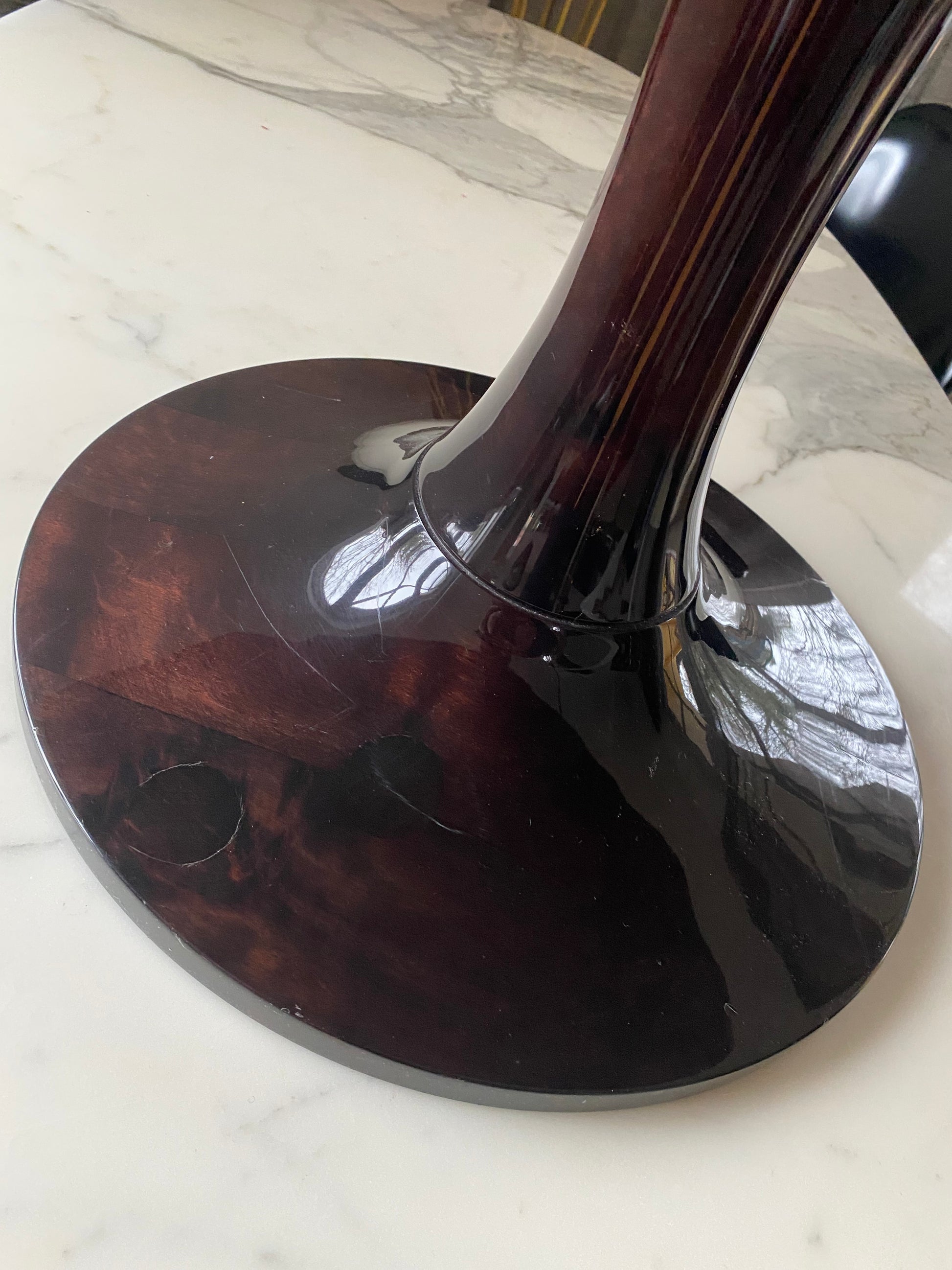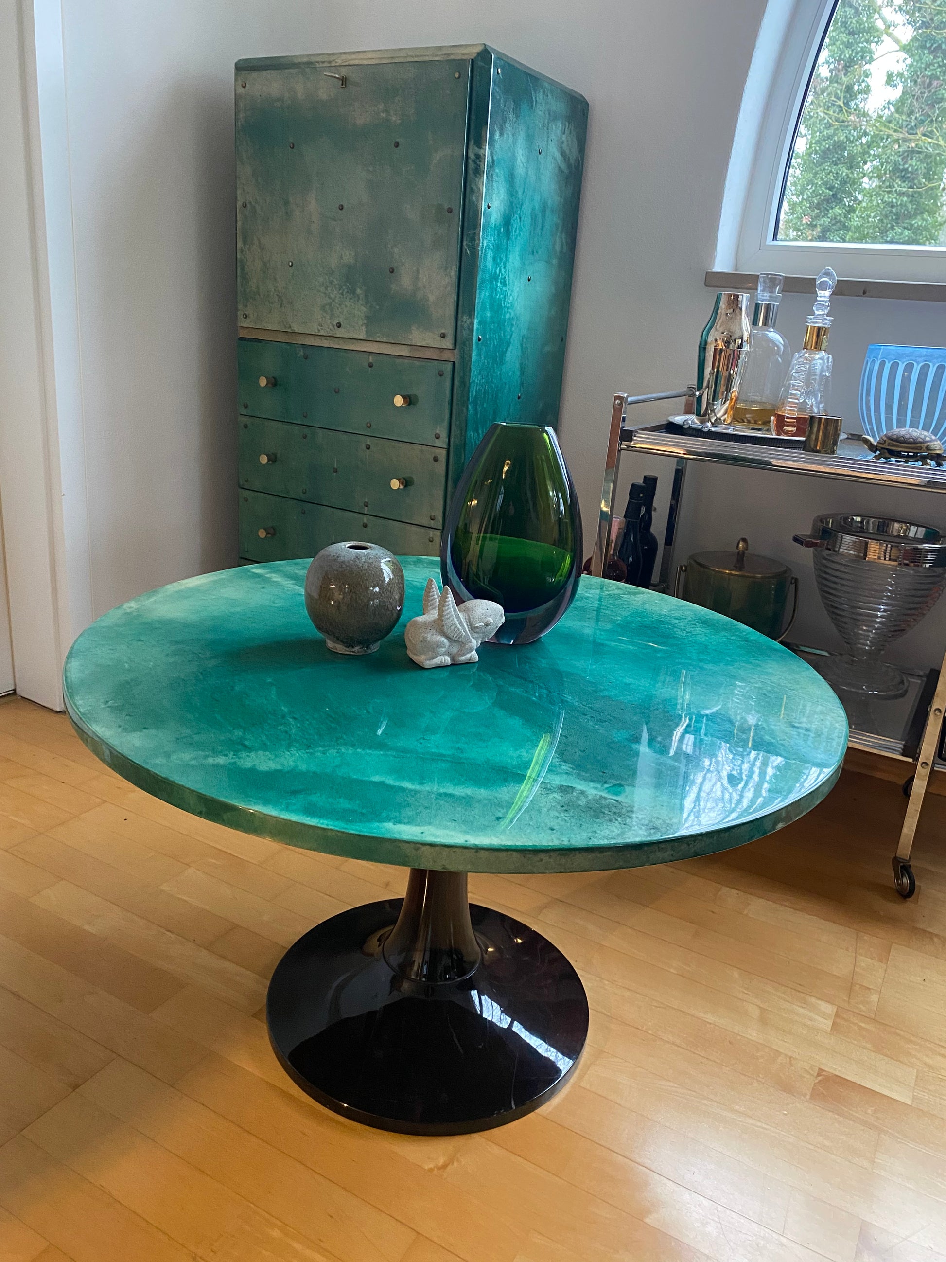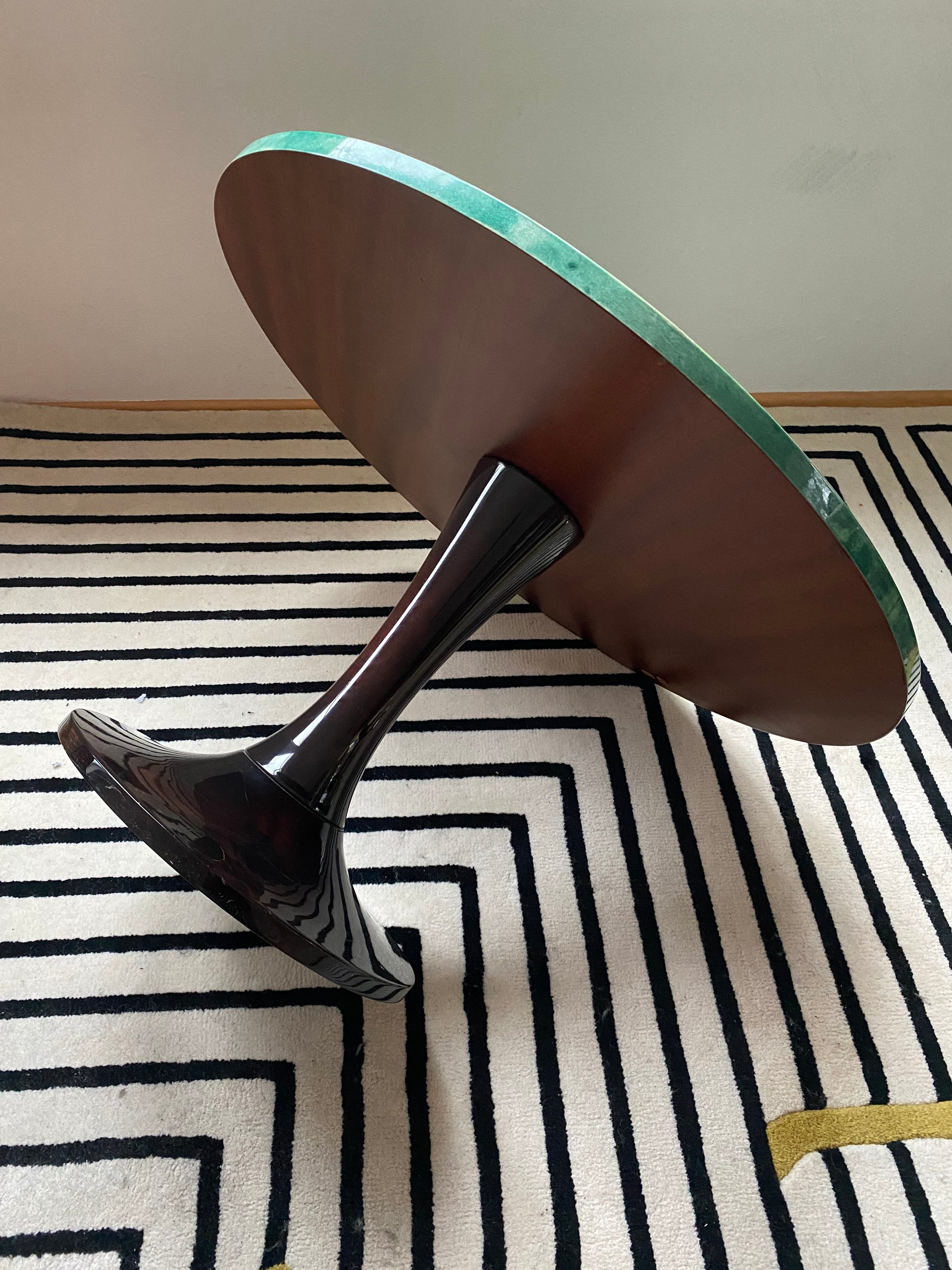 While the tulip base is typically associated with the iconic designs of Eero Saarinen for Knoll, Tura successfully developed the idea further, by covering the table top in his signature lacquered goatskin and giving it a marble like finish!