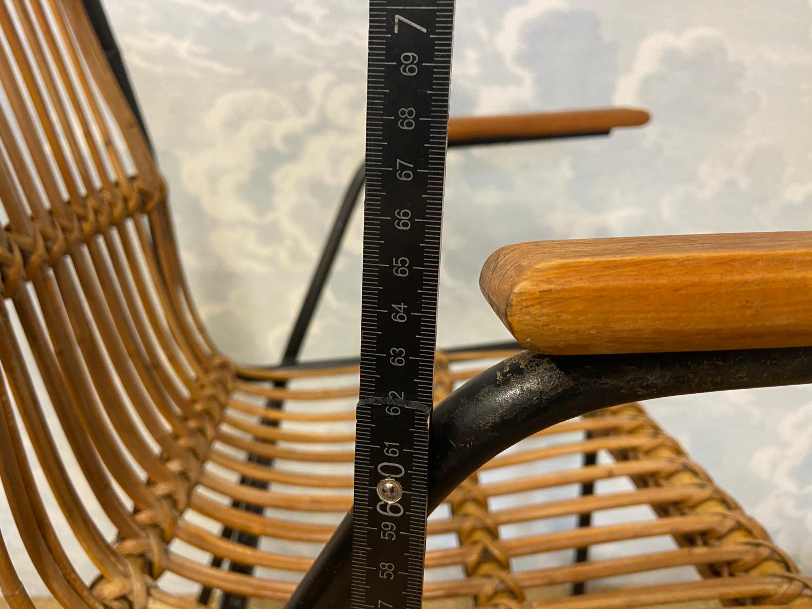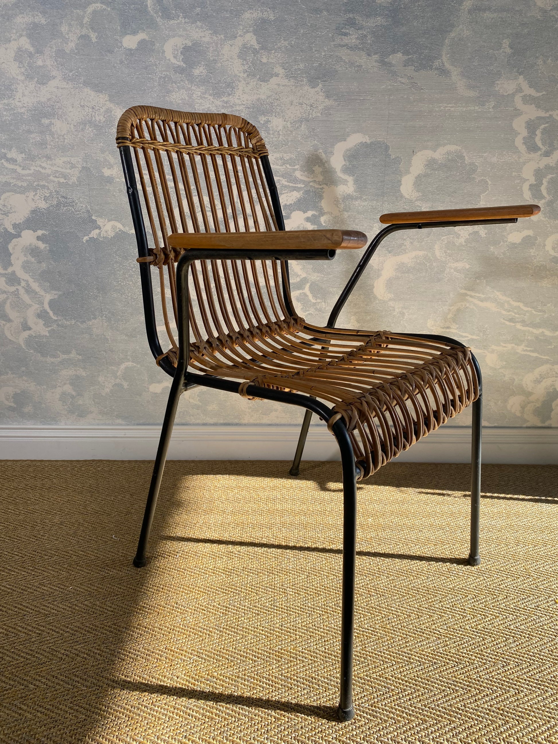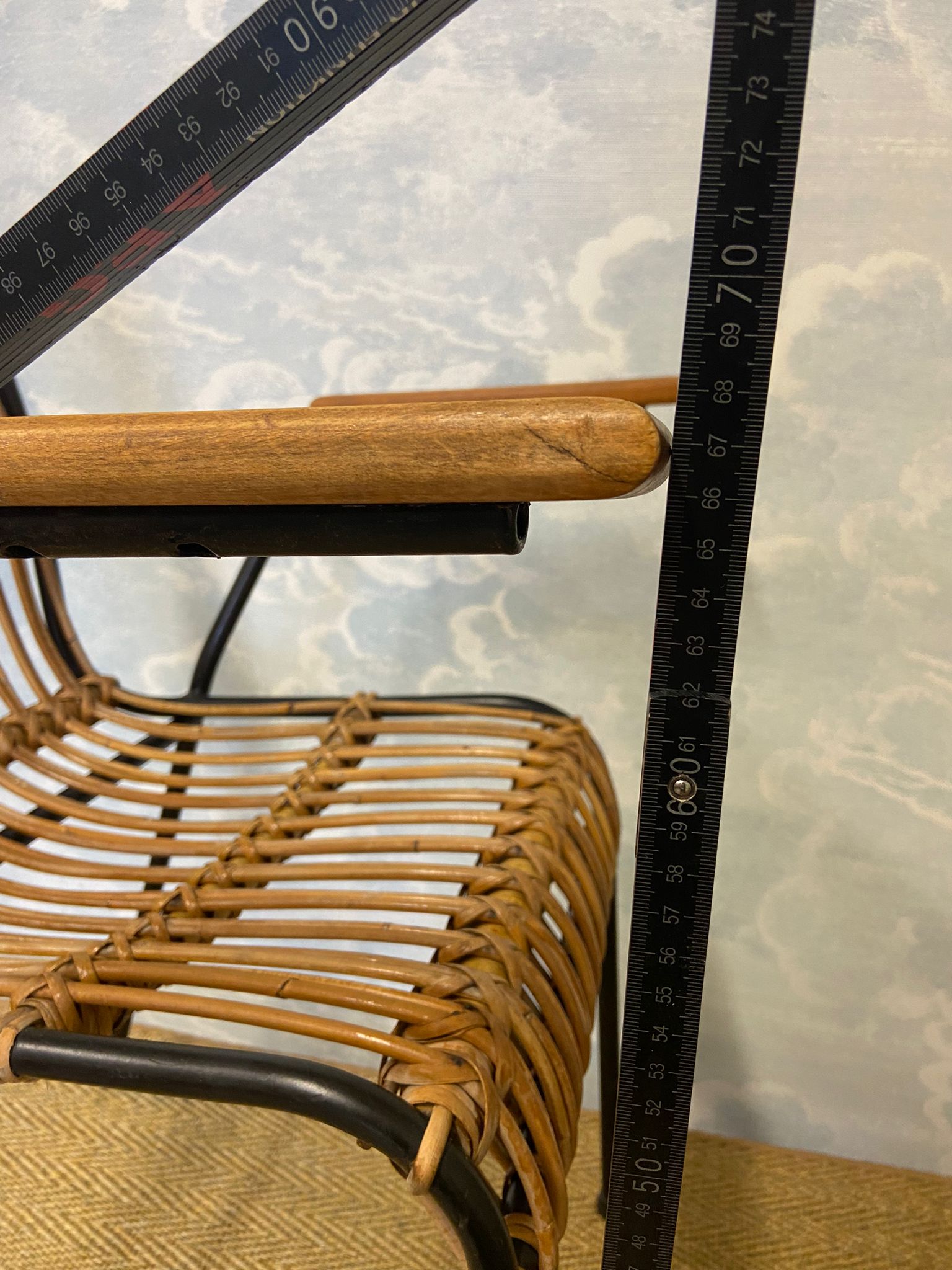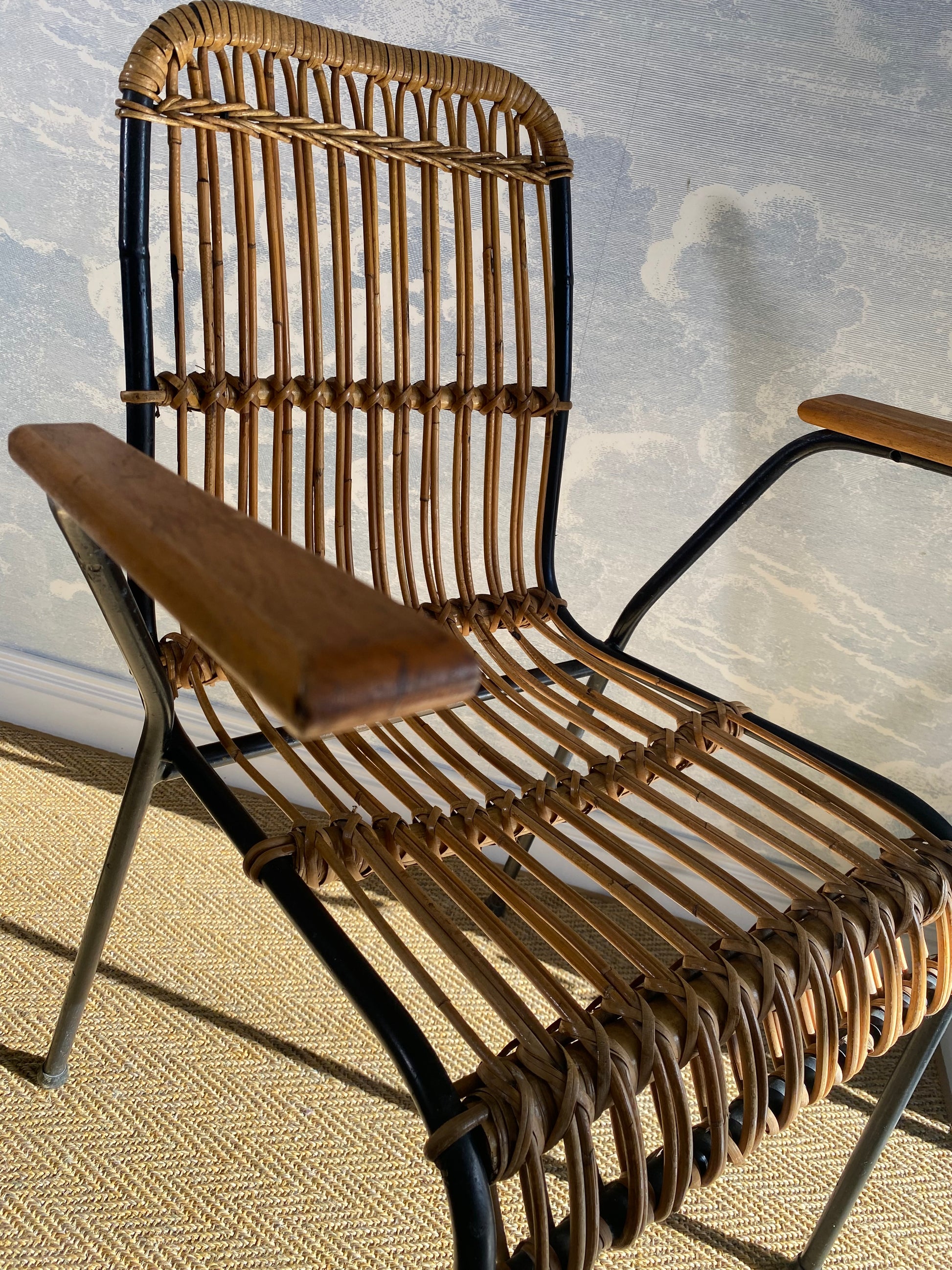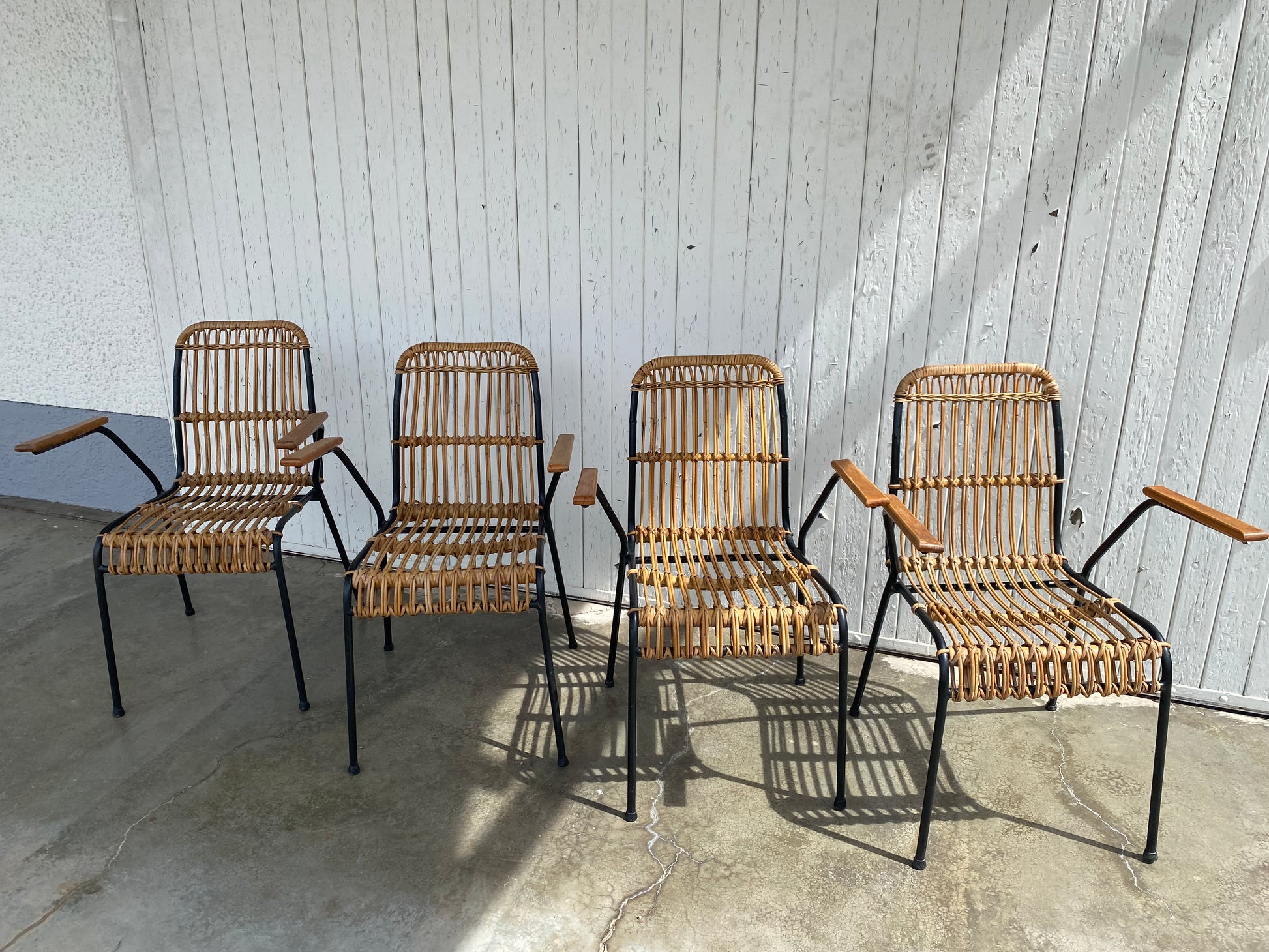 This set of outdoor furniture was clearly well looked after by the previous owners and it shows. Super chic and in very good condition, the hand crafted rattan still fits tightly to the black iron frame. The bamboo shows a beautiful & healthy patina making this set of four chairs the perfect for pool, garden and terrace settings.