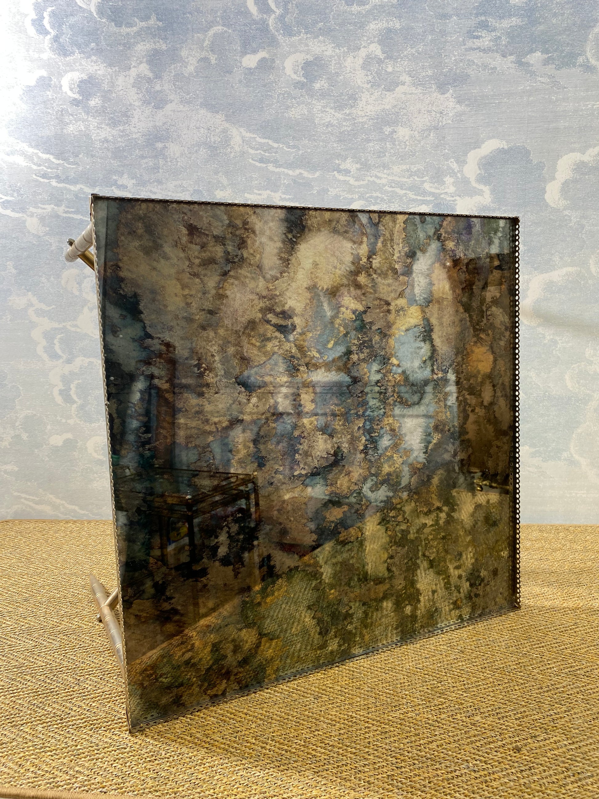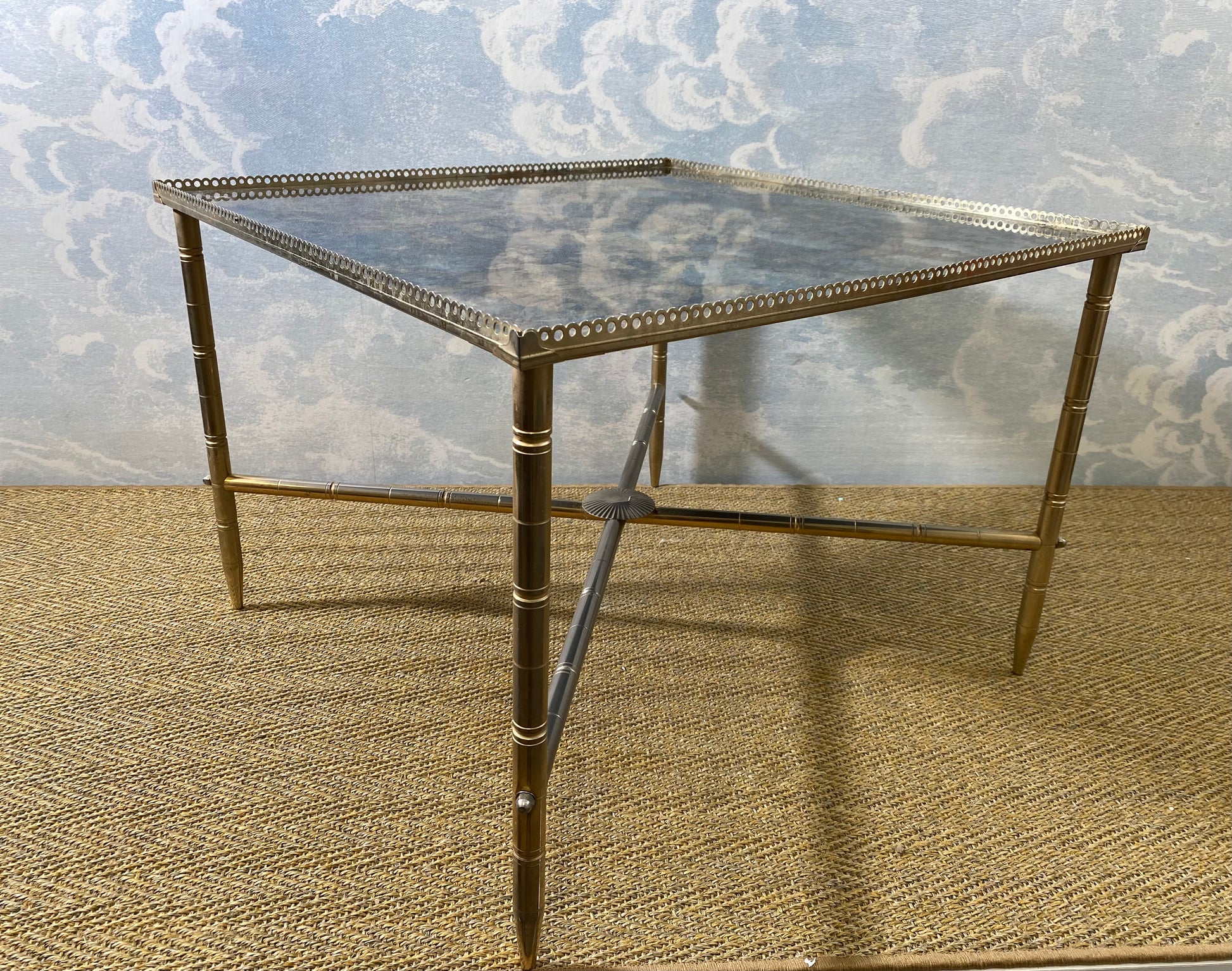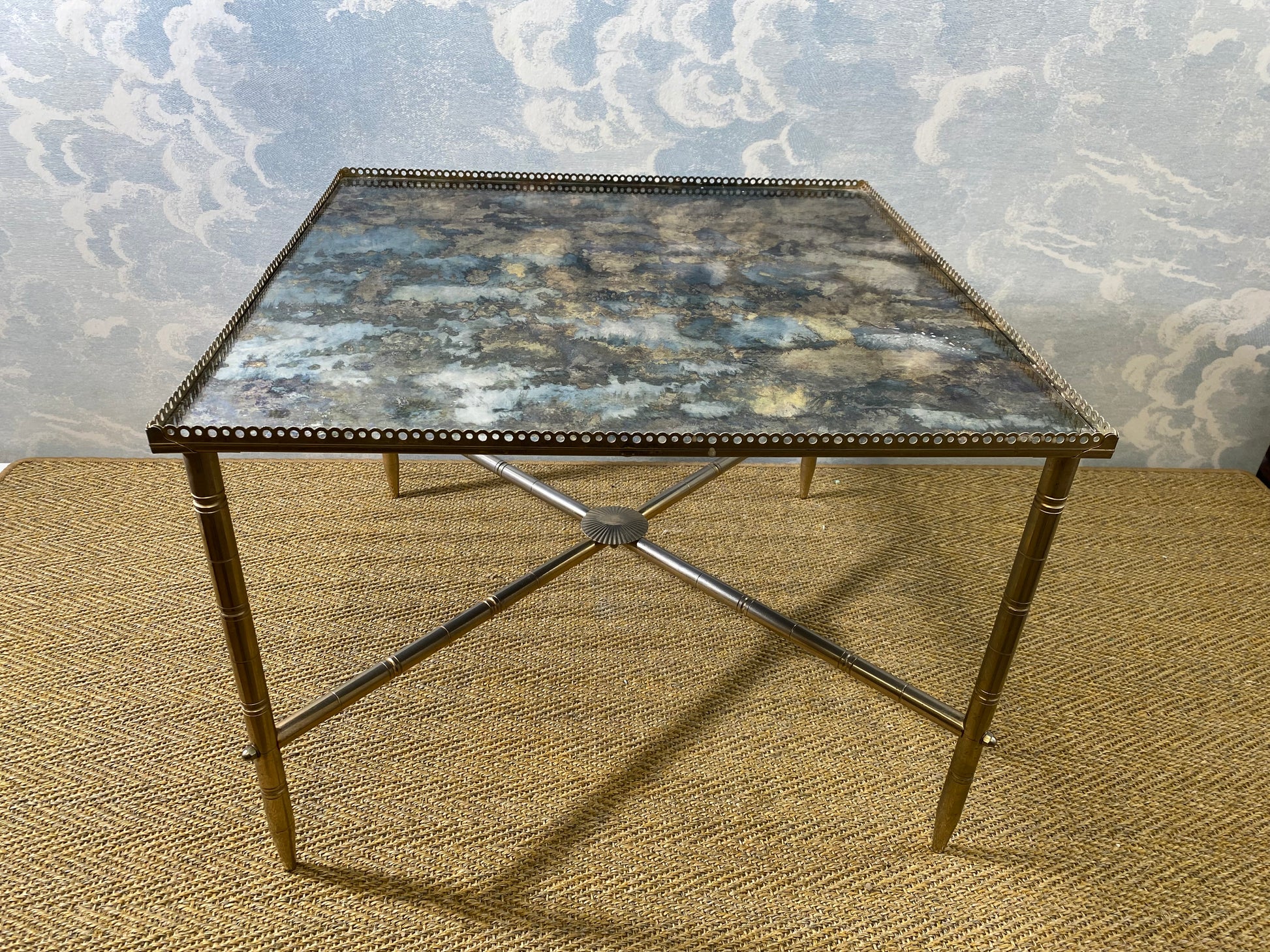 The square table top is made out of a mirrored oxidized metal which gives it an almost marble like look. The surrounding perforated brass gallery gives this table an elegant finish.
