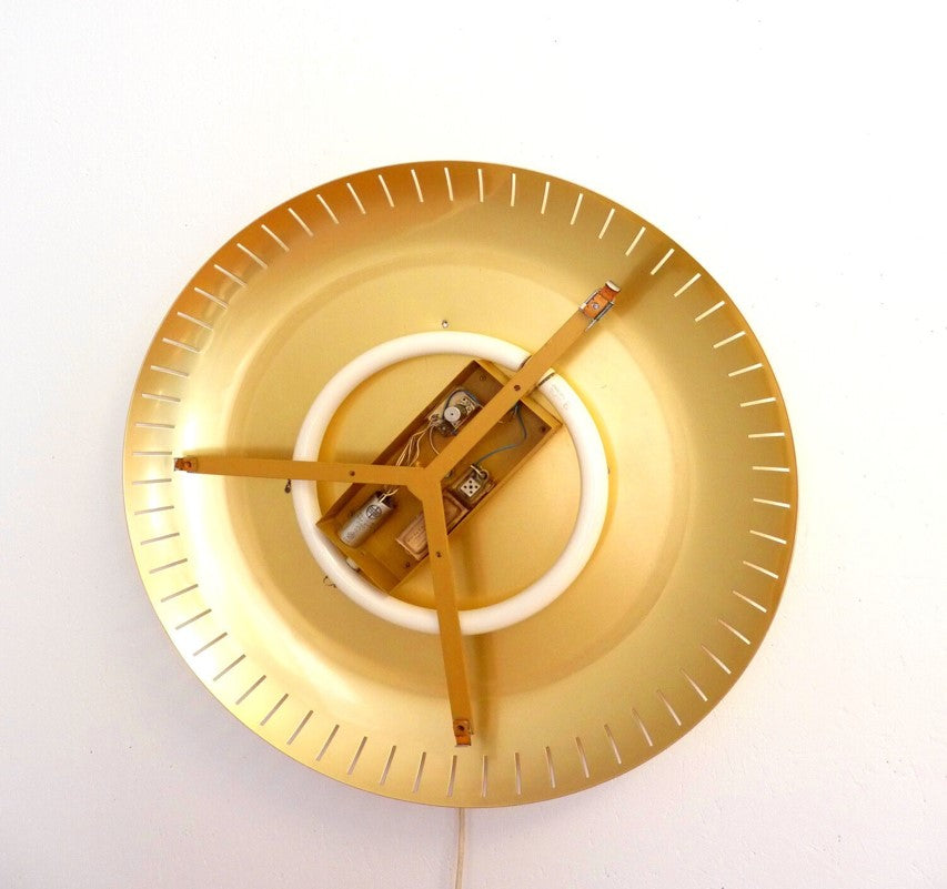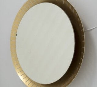 This medium sized backlit wall mirror is set on a cream colored brass plate with beautiful brass details and rim.