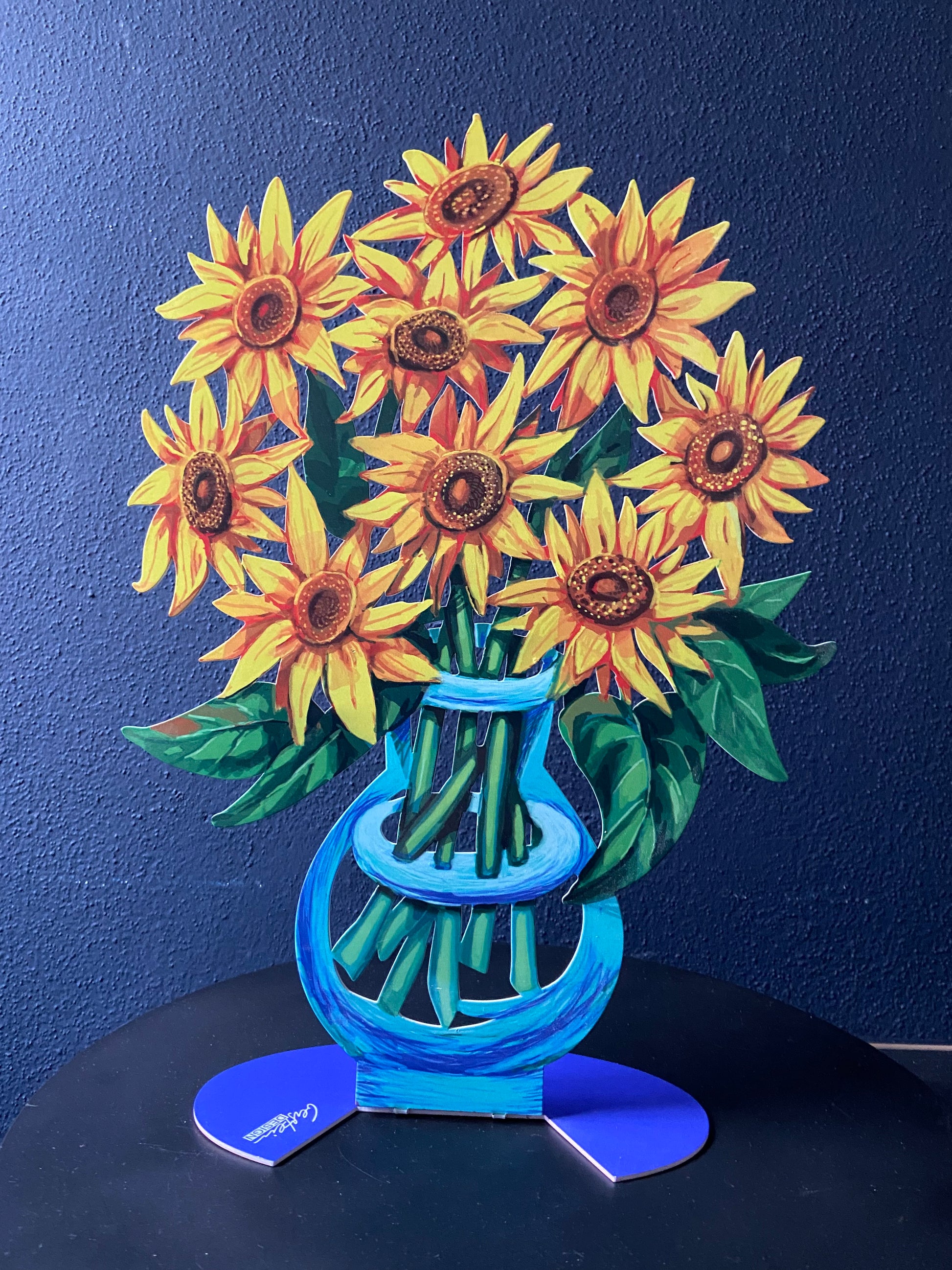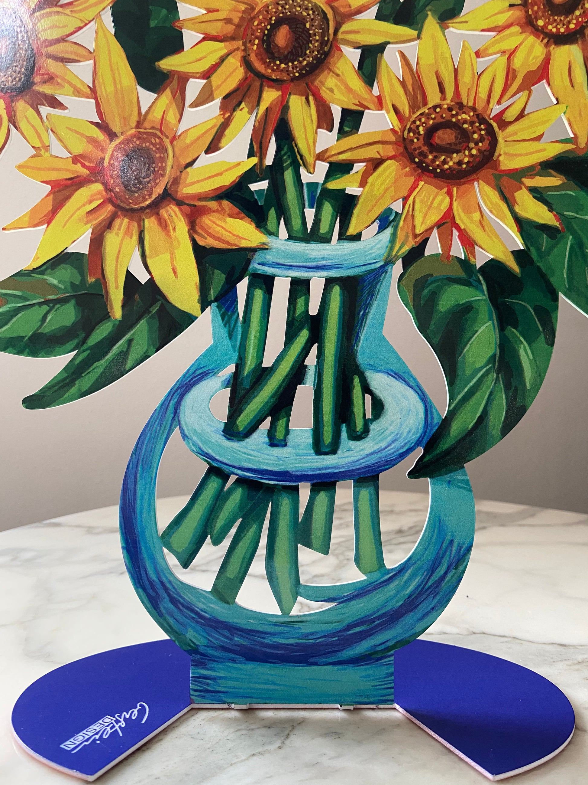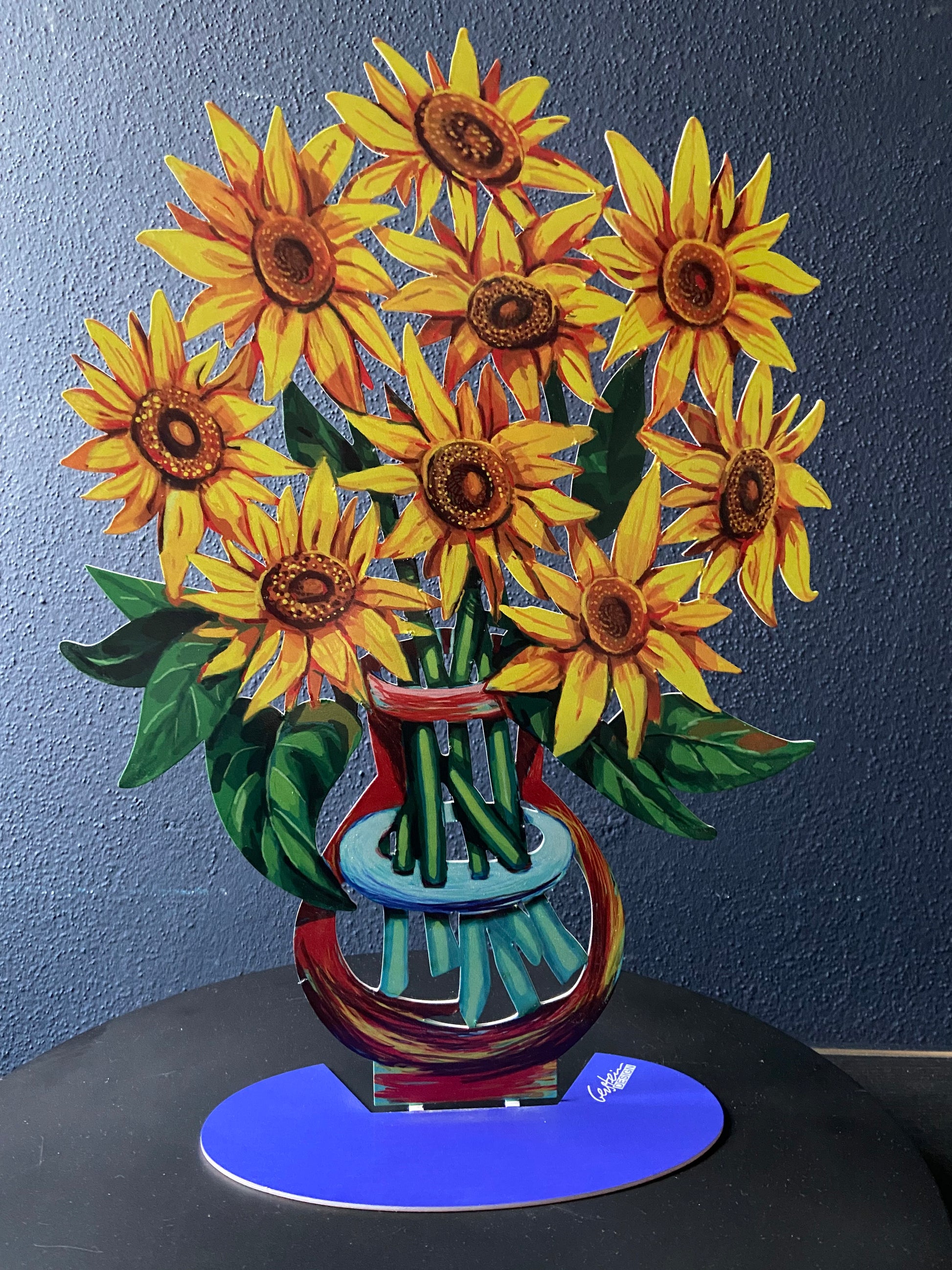 Part of Gerstein's "Flowers" collection, this freestanding steel cut-out sculpture features nine sunflowers in a vase. Depending on which side is showing forward the the vase is either colored in blue or brown.