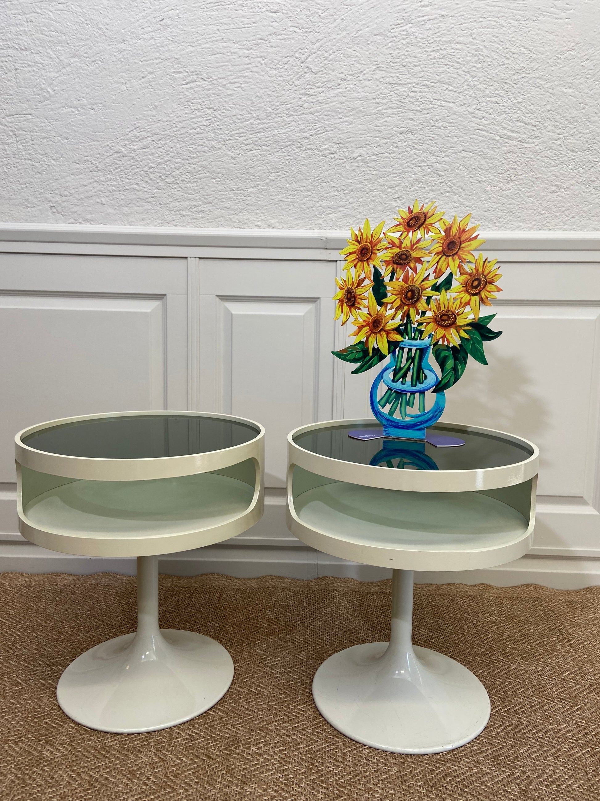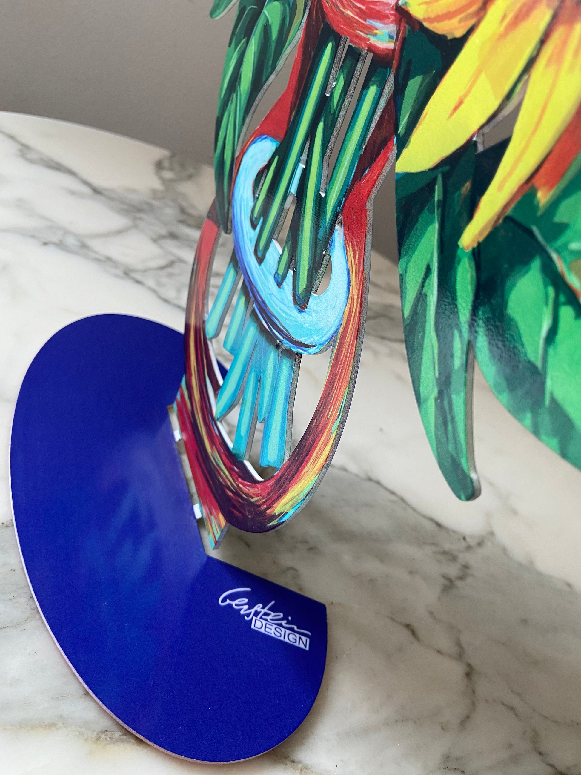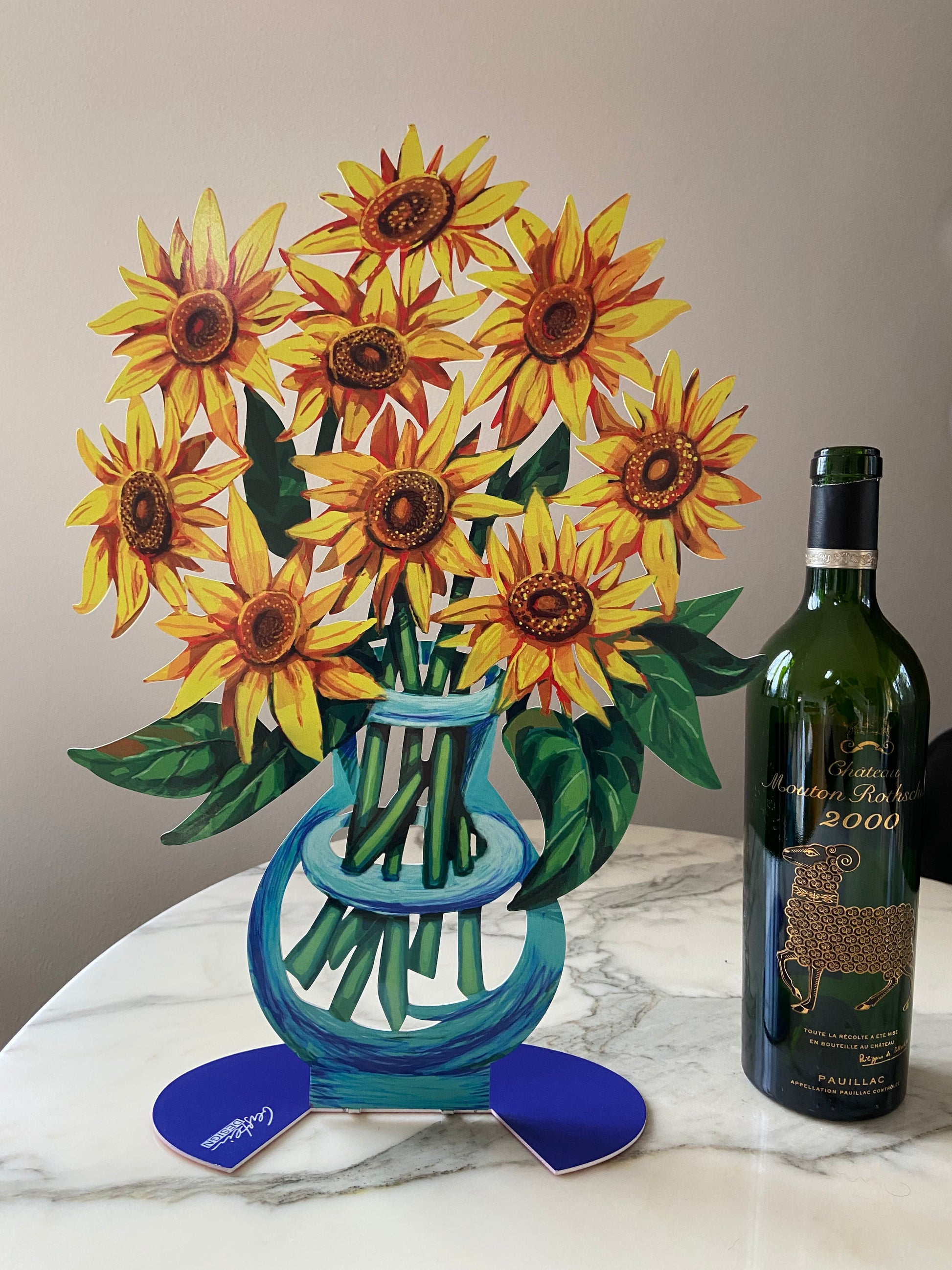 Part of Gerstein's "Flowers" collection, this freestanding steel cut-out sculpture features nine sunflowers in a vase. Depending on which side is showing forward the the vase is either colored in blue or brown.