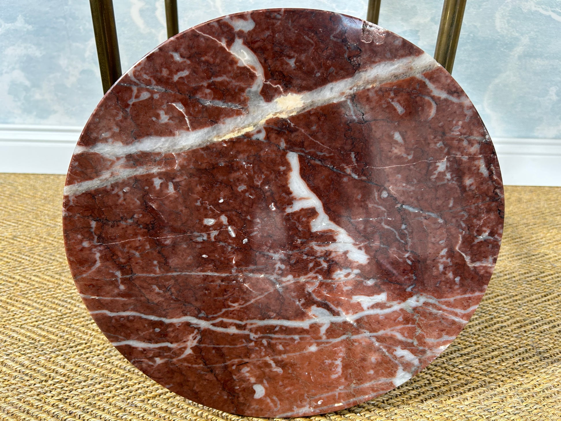 Set on a brass frame with four legs, the circular marble top and the matching shelf are made from Emperador marble, known for its rich brown and gray tones and light veining.