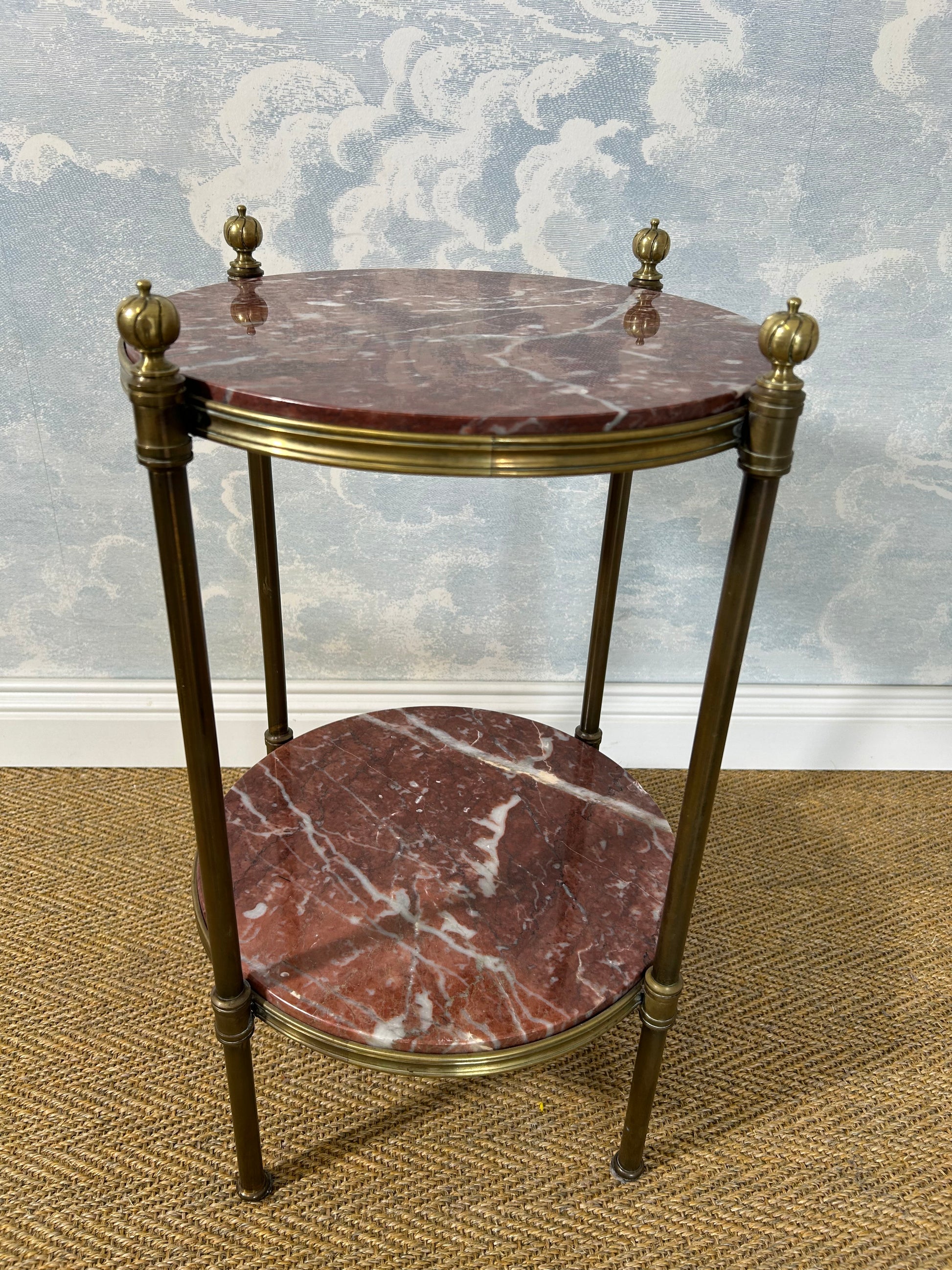 The ribbed sphere brass finials along with the marble tops give on this attractive little side table a rather sophisticated appearance.