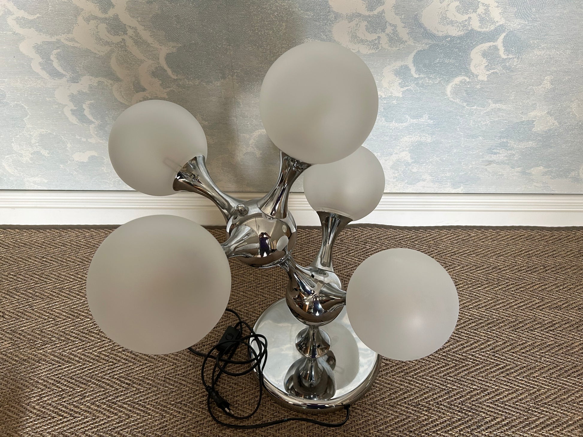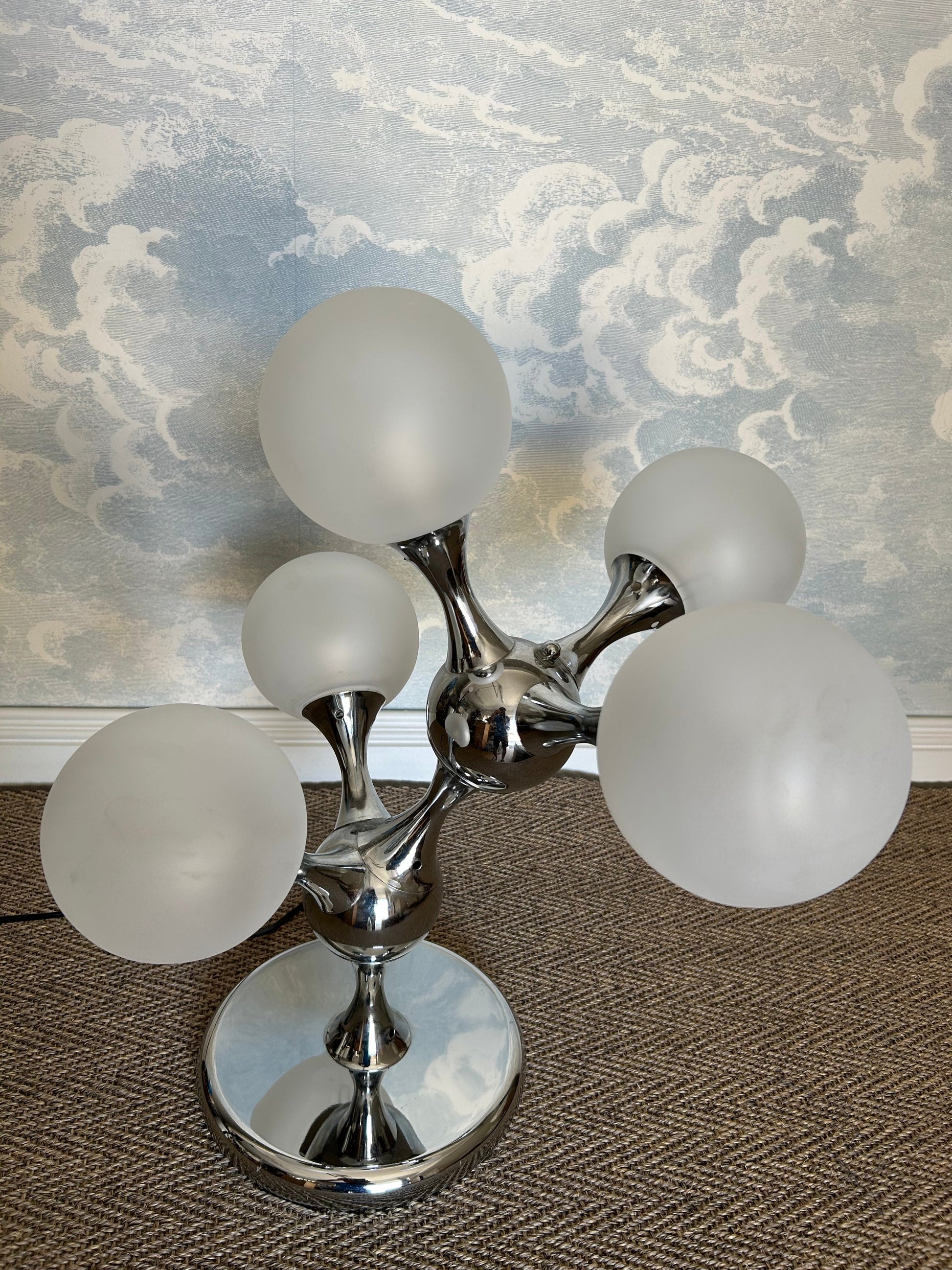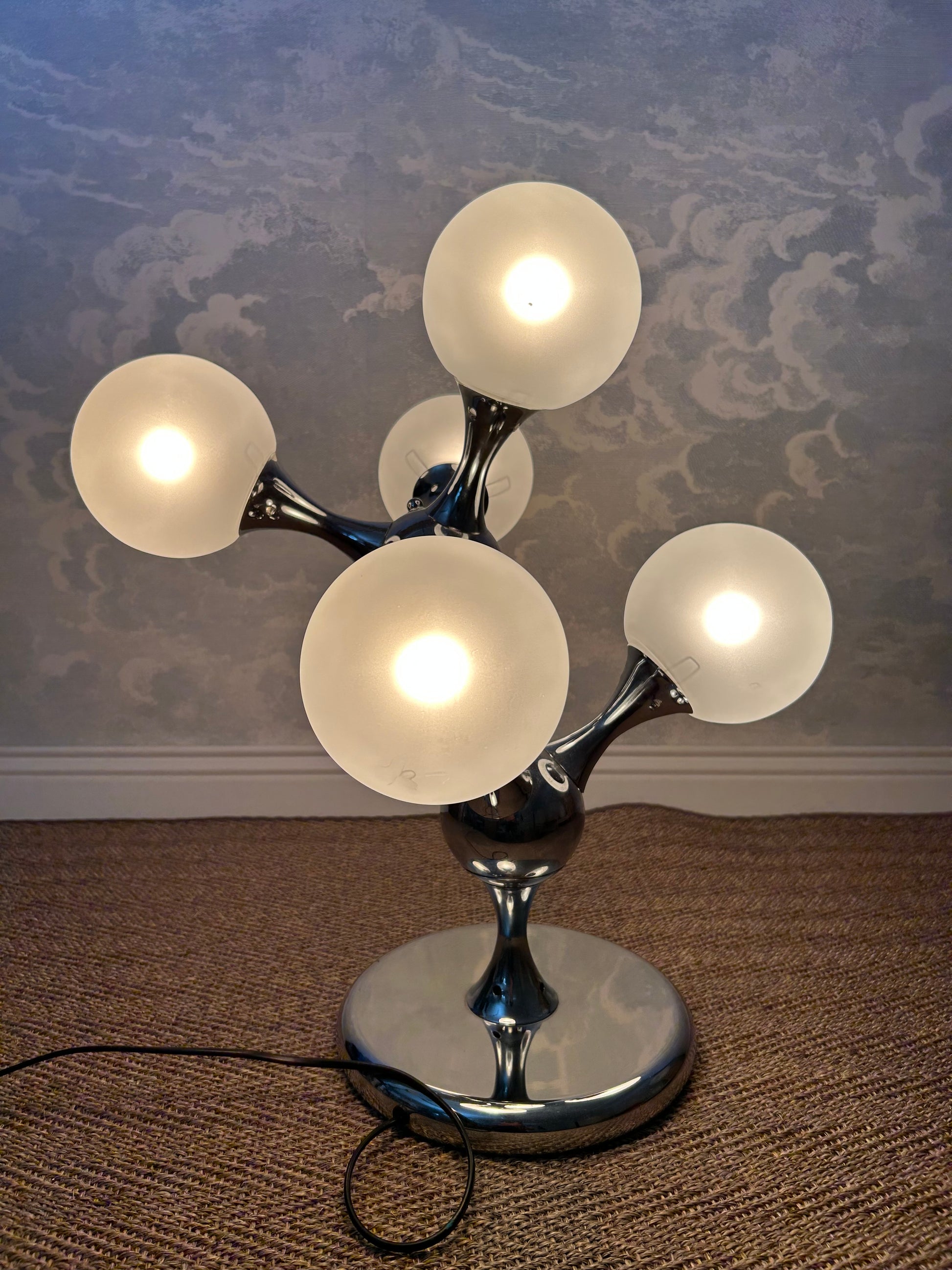 Holding five opaque spheres, arranged around two central atoms, the chrome frame acts as the bonds which form this sculptural molecule - truly an eye catcher lit or unlit.