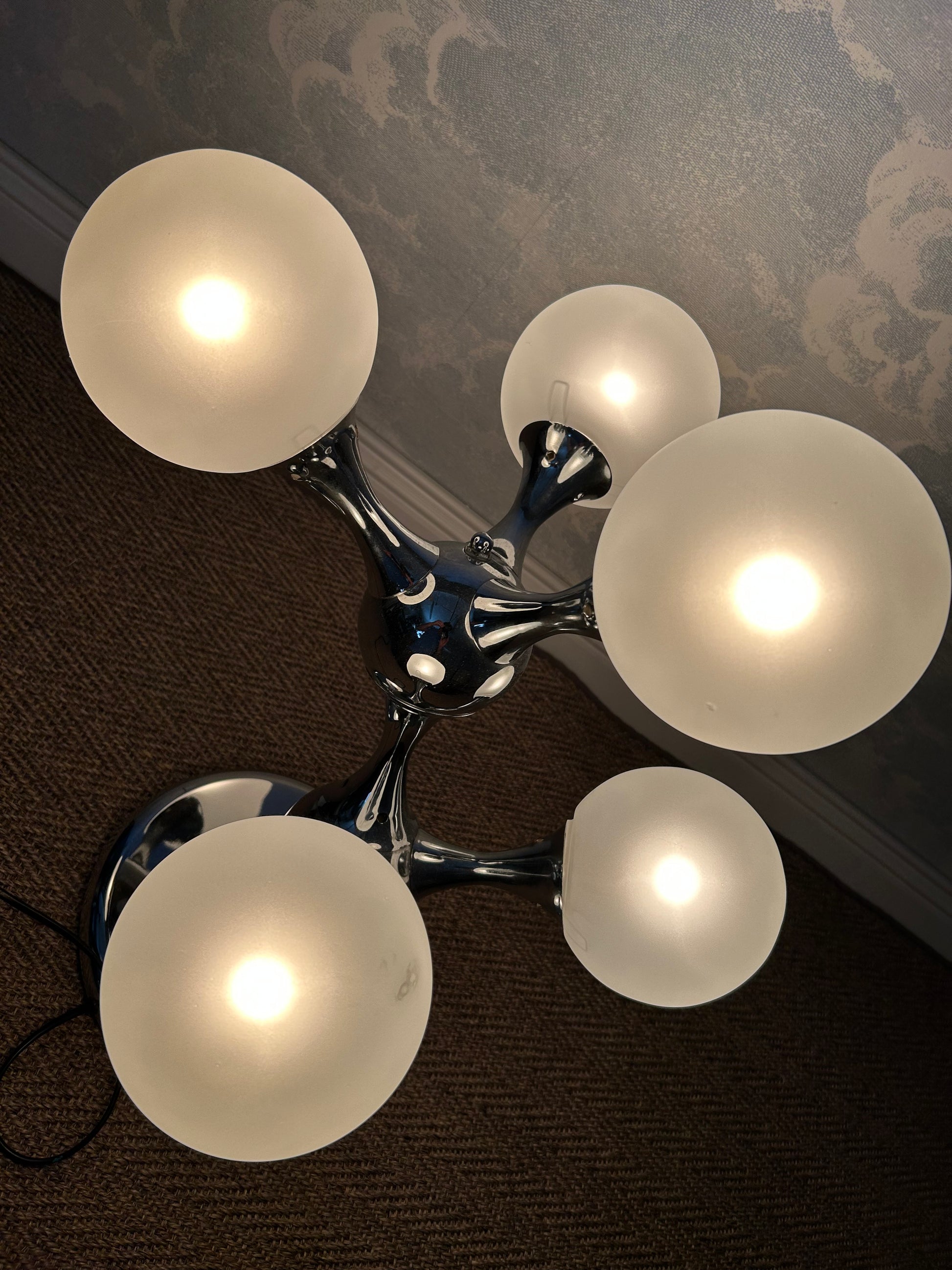 This light fixture is in very good stable condition with only few signs of its age and the chrome has retained its shine throughout the years. The spheres show some slight discolorations when inspected very closely.