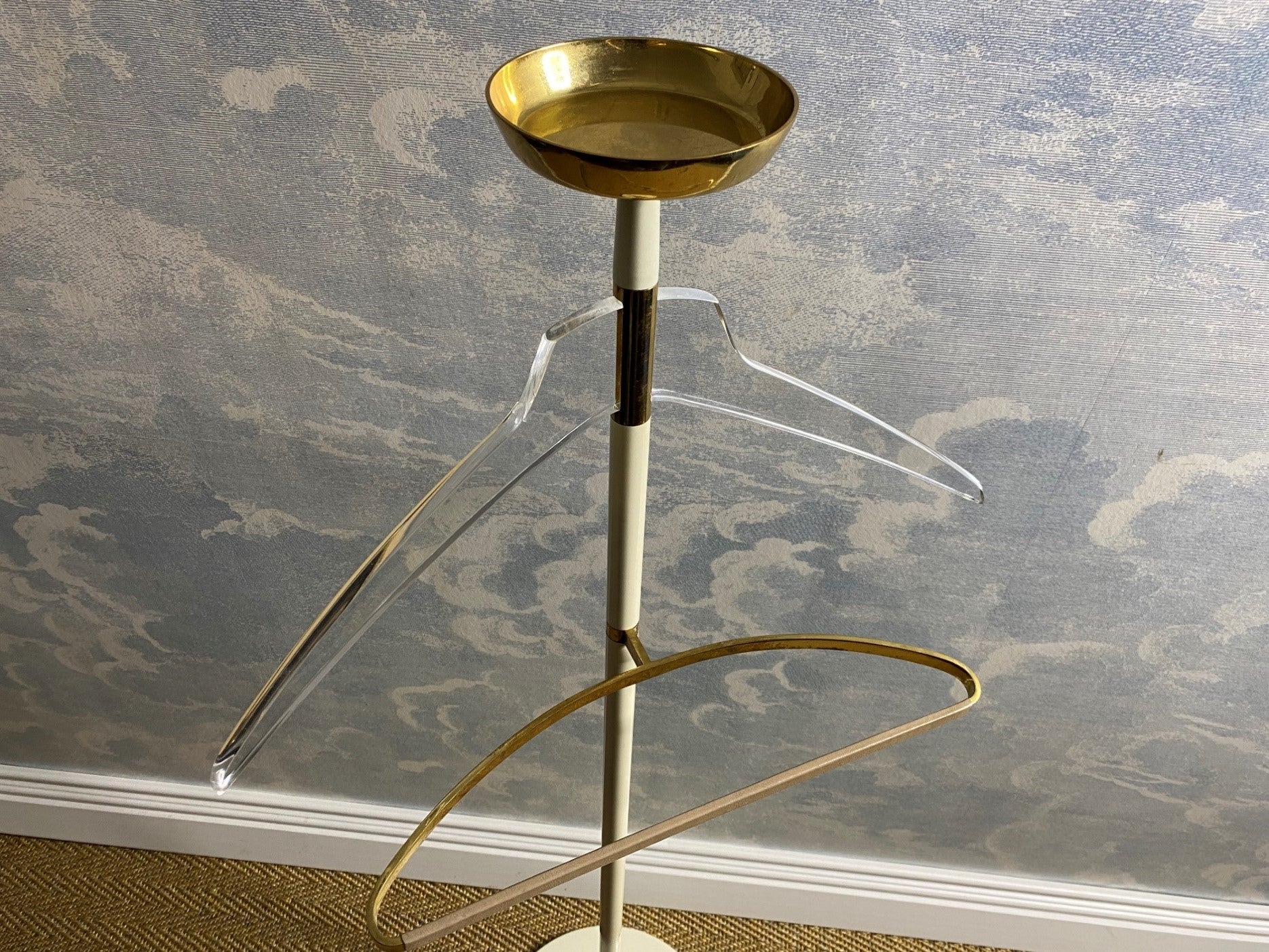 This cool gentleman´s (or gentleperson's) valet stand impresses with its modernist style and includes a brass bowl for cufflinks / belt, a Lucite coat hanger and a pants hanger made from brass and leather leather. It combines the look of a modern sculpture with a useful daily object, great design at it´s best.