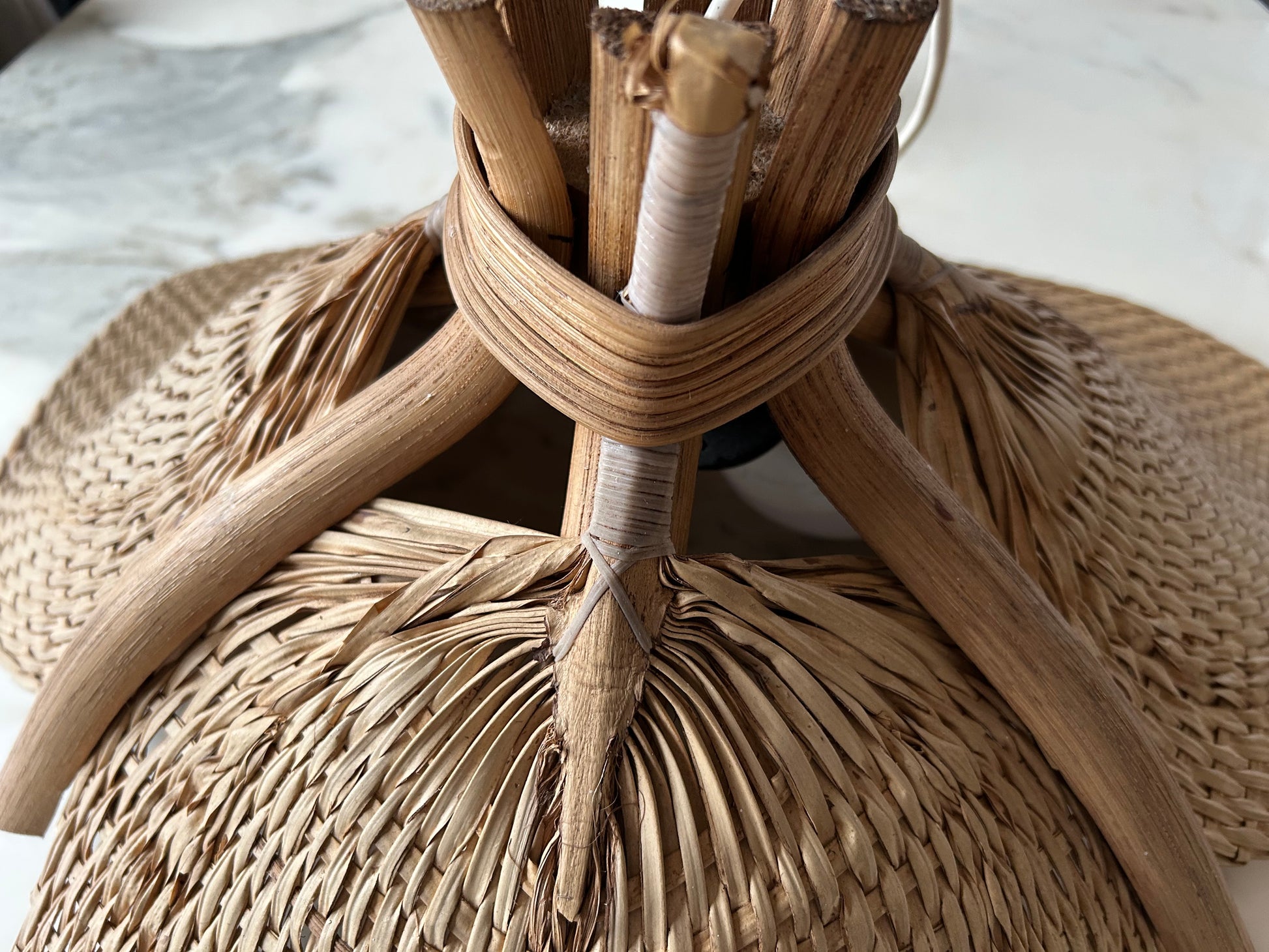 Woven from the fibers of the raffia palm tree, 3 overlapping fans are arranged around three bamboo rings supported by six strip-wood bridges. single E27 screw bulb.